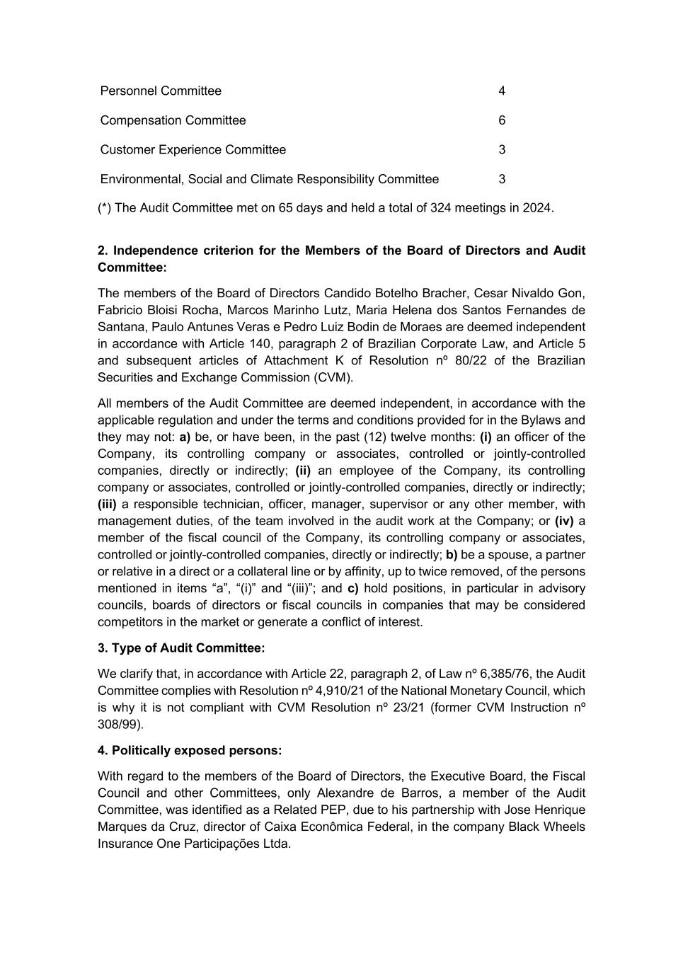 Personnel Committee 4 Compensation Committee 6 Customer Experience Committee 3 Environmental, Social and Climate Responsibility Committee 3 (*) The Audit Committee met on 65 days and held a total of 324 meetings in 2024. 2. Independence criterion for the Members of the Board of Directors and Audit Committee: The members of the Board of Directors Candido Botelho Bracher, Cesar Nivaldo Gon, Fabricio Bloisi Rocha, Marcos Marinho Lutz, Maria Helena dos Santos Fernandes de Santana, Paulo Antunes Veras e Pedro Luiz Bodin de Moraes are deemed independent in accordance with Article 140, paragraph 2 of Brazilian Corporate Law, and Article 5 and subsequent articles of Attachment K of Resolution nº 80/22 of the Brazilian Securities and Exchange Commission (CVM). All members of the Audit Committee are deemed independent, in accordance with the applicable regulation and under the terms and conditions provided for in the Bylaws and they may not: a) be, or have been, in the past (12) twelve months: (i) an officer of the Company, its controlling company or associates, controlled or jointly-controlled companies, directly or indirectly; (ii) an employee of the Company, its controlling company or associates, controlled or jointly-controlled companies, directly or indirectly; (iii) a responsible technician, officer, manager, supervisor or any other member, with management duties, of the team involved in the audit work at the Company; or (iv) a member of the fiscal council of the Company, its controlling company or associates, controlled or jointly-controlled companies, directly or indirectly; b) be a spouse, a partner or relative in a direct or a collateral line or by affinity, up to twice removed, of the persons mentioned in items “a”, “(i)” and “(iii)”; and c) hold positions, in particular in advisory councils, boards of directors or fiscal councils in companies that may be considered competitors in the market or generate a conflict of interest. 3. Type of Audit Committee: We clarify that, in accordance with Article 22, paragraph 2, of Law nº 6,385/76, the Audit Committee complies with Resolution nº 4,910/21 of the National Monetary Council, which is why it is not compliant with CVM Resolution nº 23/21 (former CVM Instruction nº 308/99). 4. Politically exposed persons: With regard to the members of the Board of Directors, the Executive Board, the Fiscal Council and other Committees, only Alexandre de Barros, a member of the Audit Committee, was identified as a Related PEP, due to his partnership with Jose Henrique Marques da Cruz, director of Caixa Econômica Federal, in the company Black Wheels Insurance One Participações Ltda.