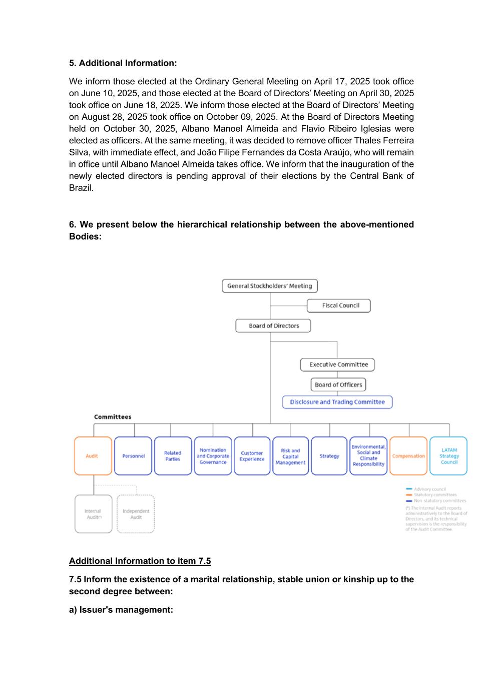 5. Additional Information: We inform those elected at the Ordinary General Meeting on April 17, 2025 took office on June 10, 2025, and those elected at the Board of Directors’ Meeting on April 30, 2025 took office on June 18, 2025. We inform those elected at the Board of Directors’ Meeting on August 28, 2025 took office on October 09, 2025. At the Board of Directors Meeting held on October 30, 2025, Albano Manoel Almeida and Flavio Ribeiro Iglesias were elected as officers. At the same meeting, it was decided to remove officer Thales Ferreira Silva, with immediate effect, and João Filipe Fernandes da Costa Araújo, who will remain in office until Albano Manoel Almeida takes office. We inform that the inauguration of the newly elected directors is pending approval of their elections by the Central Bank of Brazil. 6. We present below the hierarchical relationship between the above-mentioned Bodies: Additional Information to item 7.5 7.5 Inform the existence of a marital relationship, stable union or kinship up to the second degree between: a) Issuer's management: