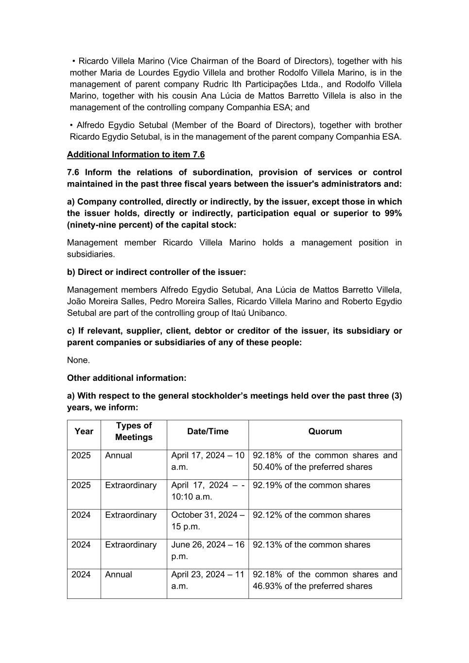 • Ricardo Villela Marino (Vice Chairman of the Board of Directors), together with his mother Maria de Lourdes Egydio Villela and brother Rodolfo Villela Marino, is in the management of parent company Rudric Ith Participações Ltda., and Rodolfo Villela Marino, together with his cousin Ana Lúcia de Mattos Barretto Villela is also in the management of the controlling company Companhia ESA; and • Alfredo Egydio Setubal (Member of the Board of Directors), together with brother Ricardo Egydio Setubal, is in the management of the parent company Companhia ESA. Additional Information to item 7.6 7.6 Inform the relations of subordination, provision of services or control maintained in the past three fiscal years between the issuer's administrators and: a) Company controlled, directly or indirectly, by the issuer, except those in which the issuer holds, directly or indirectly, participation equal or superior to 99% (ninety-nine percent) of the capital stock: Management member Ricardo Villela Marino holds a management position in subsidiaries. b) Direct or indirect controller of the issuer: Management members Alfredo Egydio Setubal, Ana Lúcia de Mattos Barretto Villela, João Moreira Salles, Pedro Moreira Salles, Ricardo Villela Marino and Roberto Egydio Setubal are part of the controlling group of Itaú Unibanco. c) If relevant, supplier, client, debtor or creditor of the issuer, its subsidiary or parent companies or subsidiaries of any of these people: None. Other additional information: a) With respect to the general stockholder’s meetings held over the past three (3) years, we inform: Year Types of Meetings Date/Time Quorum 2025 Annual April 17, 2024 – 10 a.m. 92.18% of the common shares and 50.40% of the preferred shares 2025 Extraordinary April 17, 2024 – - 10:10 a.m. 92.19% of the common shares 2024 Extraordinary October 31, 2024 – 15 p.m. 92.12% of the common shares 2024 Extraordinary June 26, 2024 – 16 p.m. 92.13% of the common shares 2024 Annual April 23, 2024 – 11 a.m. 92.18% of the common shares and 46.93% of the preferred shares