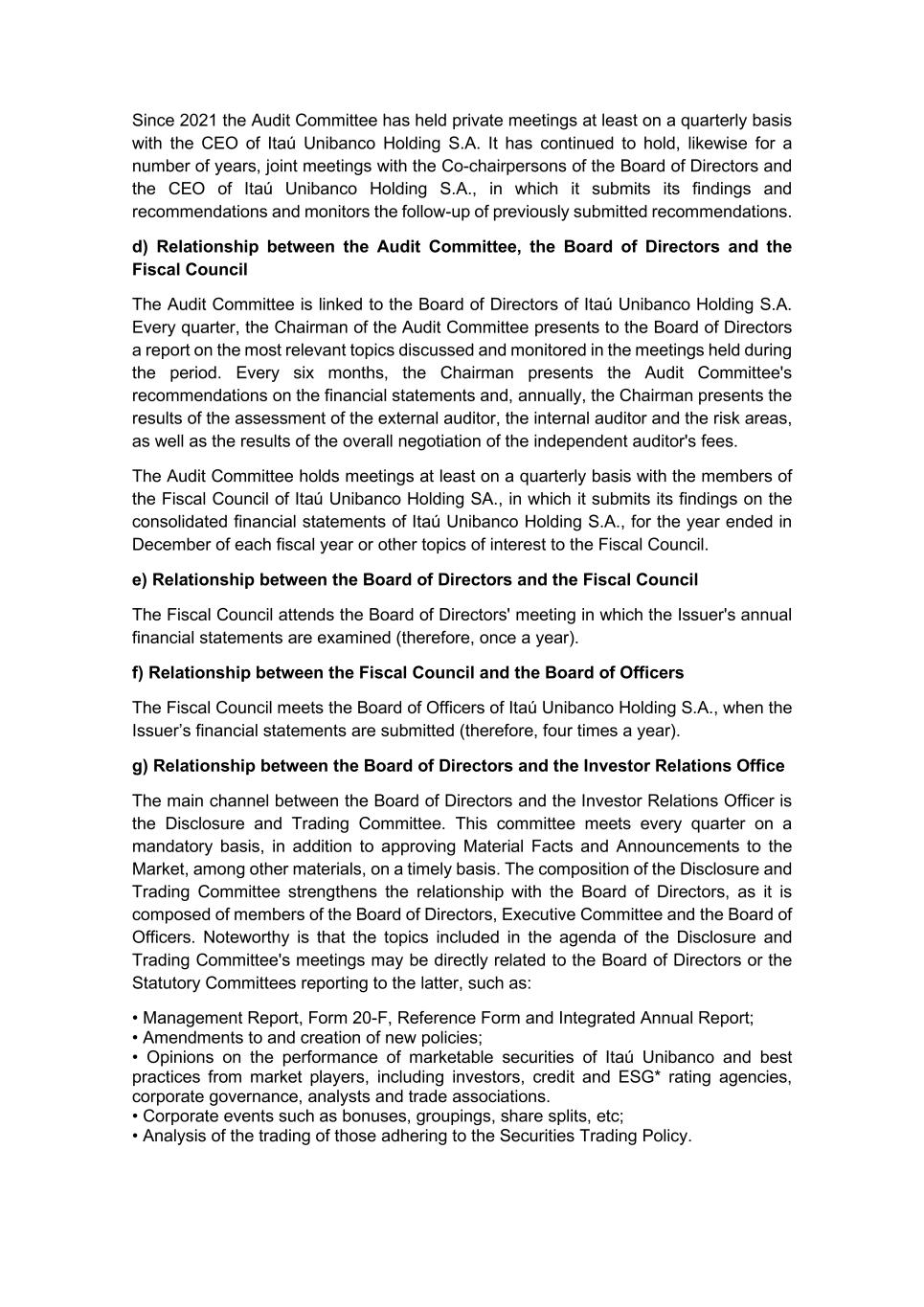 Since 2021 the Audit Committee has held private meetings at least on a quarterly basis with the CEO of Itaú Unibanco Holding S.A. It has continued to hold, likewise for a number of years, joint meetings with the Co-chairpersons of the Board of Directors and the CEO of Itaú Unibanco Holding S.A., in which it submits its findings and recommendations and monitors the follow-up of previously submitted recommendations. d) Relationship between the Audit Committee, the Board of Directors and the Fiscal Council The Audit Committee is linked to the Board of Directors of Itaú Unibanco Holding S.A. Every quarter, the Chairman of the Audit Committee presents to the Board of Directors a report on the most relevant topics discussed and monitored in the meetings held during the period. Every six months, the Chairman presents the Audit Committee's recommendations on the financial statements and, annually, the Chairman presents the results of the assessment of the external auditor, the internal auditor and the risk areas, as well as the results of the overall negotiation of the independent auditor's fees. The Audit Committee holds meetings at least on a quarterly basis with the members of the Fiscal Council of Itaú Unibanco Holding SA., in which it submits its findings on the consolidated financial statements of Itaú Unibanco Holding S.A., for the year ended in December of each fiscal year or other topics of interest to the Fiscal Council. e) Relationship between the Board of Directors and the Fiscal Council The Fiscal Council attends the Board of Directors' meeting in which the Issuer's annual financial statements are examined (therefore, once a year). f) Relationship between the Fiscal Council and the Board of Officers The Fiscal Council meets the Board of Officers of Itaú Unibanco Holding S.A., when the Issuer’s financial statements are submitted (therefore, four times a year). g) Relationship between the Board of Directors and the Investor Relations Office The main channel between the Board of Directors and the Investor Relations Officer is the Disclosure and Trading Committee. This committee meets every quarter on a mandatory basis, in addition to approving Material Facts and Announcements to the Market, among other materials, on a timely basis. The composition of the Disclosure and Trading Committee strengthens the relationship with the Board of Directors, as it is composed of members of the Board of Directors, Executive Committee and the Board of Officers. Noteworthy is that the topics included in the agenda of the Disclosure and Trading Committee's meetings may be directly related to the Board of Directors or the Statutory Committees reporting to the latter, such as: • Management Report, Form 20-F, Reference Form and Integrated Annual Report; • Amendments to and creation of new policies; • Opinions on the performance of marketable securities of Itaú Unibanco and best practices from market players, including investors, credit and ESG* rating agencies, corporate governance, analysts and trade associations. • Corporate events such as bonuses, groupings, share splits, etc; • Analysis of the trading of those adhering to the Securities Trading Policy.