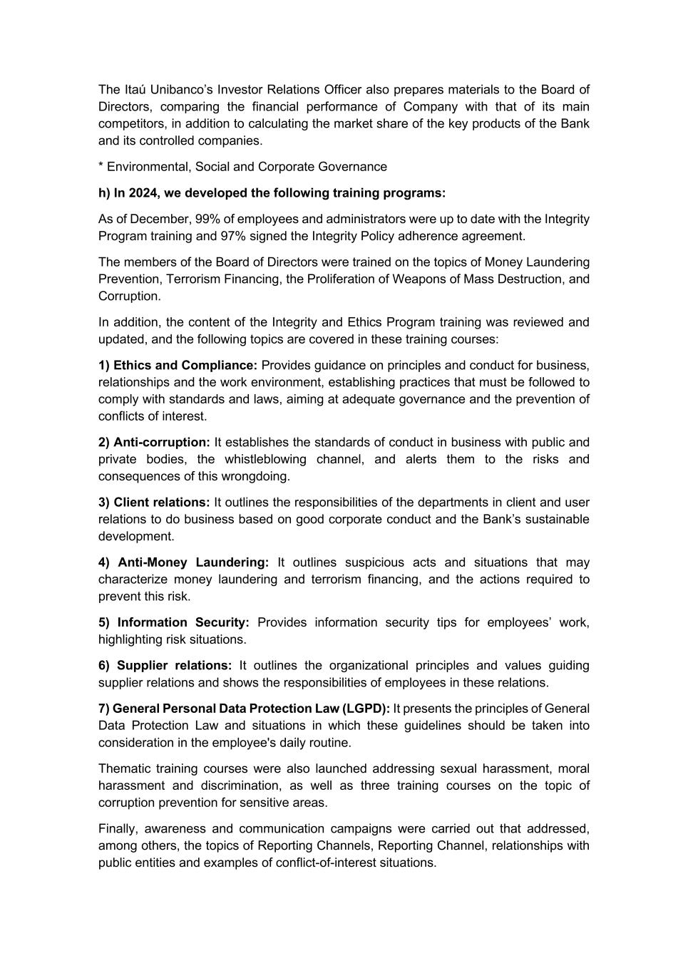 The Itaú Unibanco’s Investor Relations Officer also prepares materials to the Board of Directors, comparing the financial performance of Company with that of its main competitors, in addition to calculating the market share of the key products of the Bank and its controlled companies. * Environmental, Social and Corporate Governance h) In 2024, we developed the following training programs: As of December, 99% of employees and administrators were up to date with the Integrity Program training and 97% signed the Integrity Policy adherence agreement. The members of the Board of Directors were trained on the topics of Money Laundering Prevention, Terrorism Financing, the Proliferation of Weapons of Mass Destruction, and Corruption. In addition, the content of the Integrity and Ethics Program training was reviewed and updated, and the following topics are covered in these training courses: 1) Ethics and Compliance: Provides guidance on principles and conduct for business, relationships and the work environment, establishing practices that must be followed to comply with standards and laws, aiming at adequate governance and the prevention of conflicts of interest. 2) Anti-corruption: It establishes the standards of conduct in business with public and private bodies, the whistleblowing channel, and alerts them to the risks and consequences of this wrongdoing. 3) Client relations: It outlines the responsibilities of the departments in client and user relations to do business based on good corporate conduct and the Bank’s sustainable development. 4) Anti-Money Laundering: It outlines suspicious acts and situations that may characterize money laundering and terrorism financing, and the actions required to prevent this risk. 5) Information Security: Provides information security tips for employees’ work, highlighting risk situations. 6) Supplier relations: It outlines the organizational principles and values guiding supplier relations and shows the responsibilities of employees in these relations. 7) General Personal Data Protection Law (LGPD): It presents the principles of General Data Protection Law and situations in which these guidelines should be taken into consideration in the employee's daily routine. Thematic training courses were also launched addressing sexual harassment, moral harassment and discrimination, as well as three training courses on the topic of corruption prevention for sensitive areas. Finally, awareness and communication campaigns were carried out that addressed, among others, the topics of Reporting Channels, Reporting Channel, relationships with public entities and examples of conflict-of-interest situations.