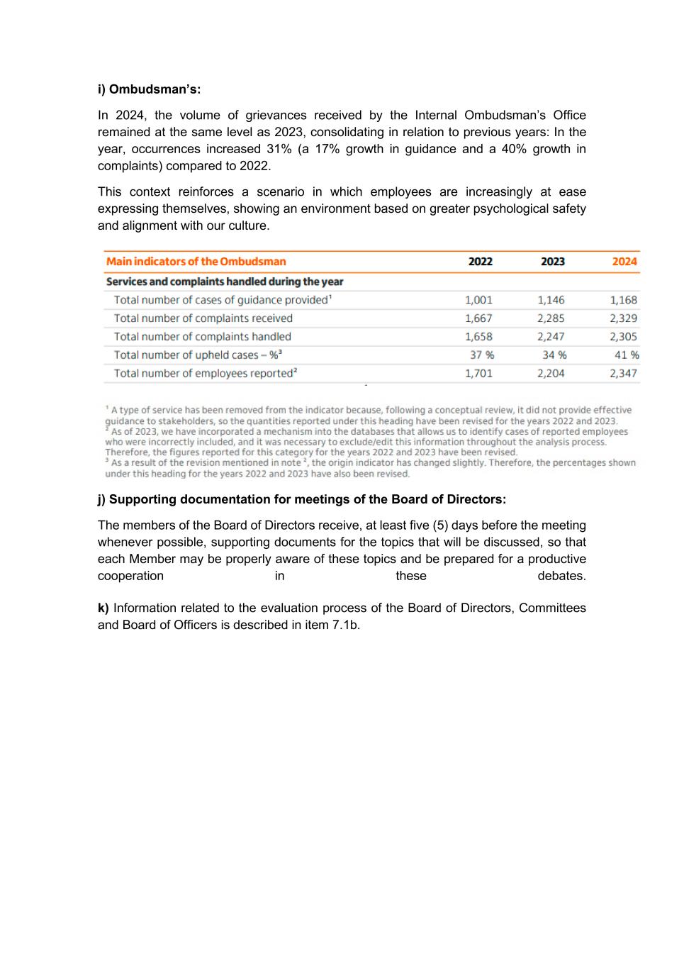 i) Ombudsman’s: In 2024, the volume of grievances received by the Internal Ombudsman’s Office remained at the same level as 2023, consolidating in relation to previous years: In the year, occurrences increased 31% (a 17% growth in guidance and a 40% growth in complaints) compared to 2022. This context reinforces a scenario in which employees are increasingly at ease expressing themselves, showing an environment based on greater psychological safety and alignment with our culture. j) Supporting documentation for meetings of the Board of Directors: The members of the Board of Directors receive, at least five (5) days before the meeting whenever possible, supporting documents for the topics that will be discussed, so that each Member may be properly aware of these topics and be prepared for a productive cooperation in these debates. k) Information related to the evaluation process of the Board of Directors, Committees and Board of Officers is described in item 7.1b.