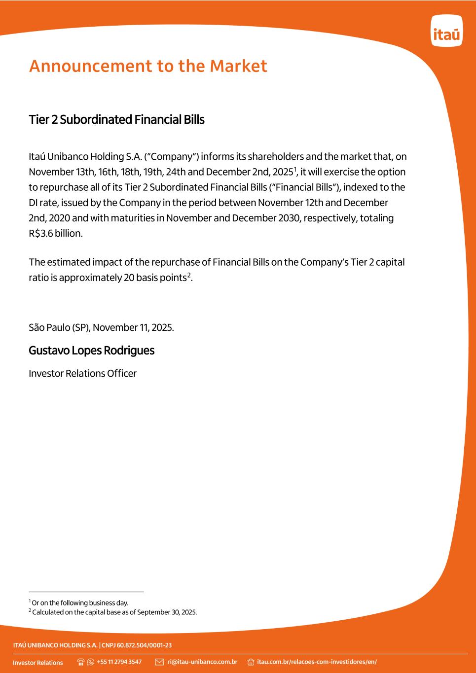 Announcement to the Market Tier 2 Subordinated Financial Bills Itaú Unibanco Holding S.A. (“Company”) informs its shareholders and the market that, on November 13th, 16th, 18th, 19th, 24th and December 2nd, 20251, it will exercise the option to repurchase all of its Tier 2 Subordinated Financial Bills (“Financial Bills”), indexed to the DI rate, issued by the Company in the period between November 12th and December 2nd, 2020 and with maturities in November and December 2030, respectively, totaling R$3.6 billion. The estimated impact of the repurchase of Financial Bills on the Company’s Tier 2 capital ratio is approximately 20 basis points2. São Paulo (SP), November 11, 2025. Gustavo Lopes Rodrigues Investor Relations Officer 1 Or on the following business day. 2 Calculated on the capital base as of September 30, 2025.