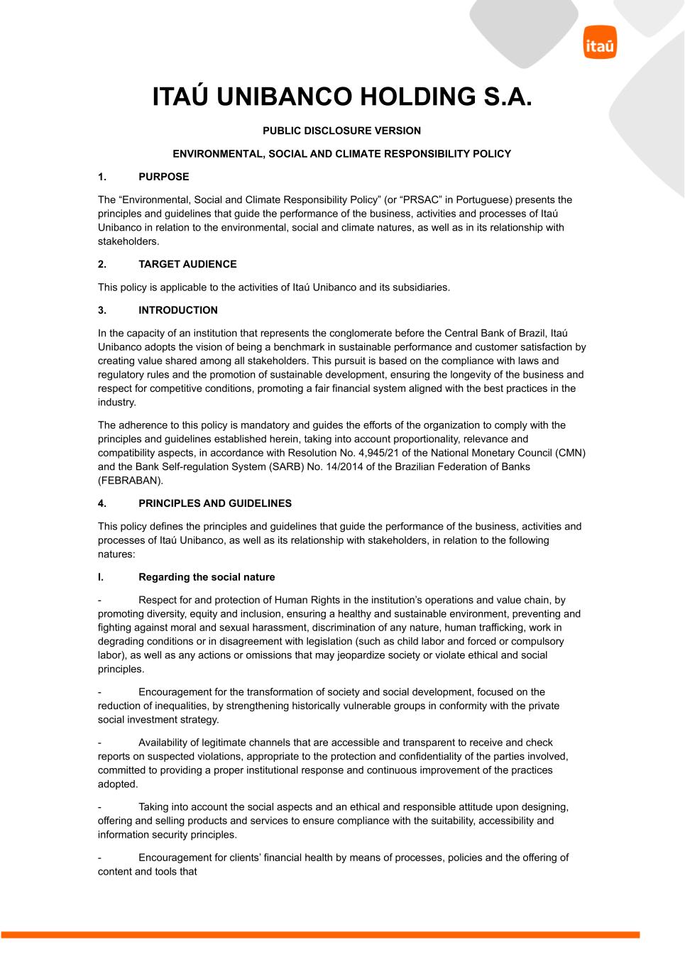 ITAÚ UNIBANCO HOLDING S.A. PUBLIC DISCLOSURE VERSION ENVIRONMENTAL, SOCIAL AND CLIMATE RESPONSIBILITY POLICY 1. PURPOSE The “Environmental, Social and Climate Responsibility Policy” (or “PRSAC” in Portuguese) presents the principles and guidelines that guide the performance of the business, activities and processes of Itaú Unibanco in relation to the environmental, social and climate natures, as well as in its relationship with stakeholders. 2. TARGET AUDIENCE This policy is applicable to the activities of Itaú Unibanco and its subsidiaries. 3. INTRODUCTION In the capacity of an institution that represents the conglomerate before the Central Bank of Brazil, Itaú Unibanco adopts the vision of being a benchmark in sustainable performance and customer satisfaction by creating value shared among all stakeholders. This pursuit is based on the compliance with laws and regulatory rules and the promotion of sustainable development, ensuring the longevity of the business and respect for competitive conditions, promoting a fair financial system aligned with the best practices in the industry. The adherence to this policy is mandatory and guides the efforts of the organization to comply with the principles and guidelines established herein, taking into account proportionality, relevance and compatibility aspects, in accordance with Resolution No. 4,945/21 of the National Monetary Council (CMN) and the Bank Self-regulation System (SARB) No. 14/2014 of the Brazilian Federation of Banks (FEBRABAN). 4. PRINCIPLES AND GUIDELINES This policy defines the principles and guidelines that guide the performance of the business, activities and processes of Itaú Unibanco, as well as its relationship with stakeholders, in relation to the following natures: I. Regarding the social nature - Respect for and protection of Human Rights in the institution’s operations and value chain, by promoting diversity, equity and inclusion, ensuring a healthy and sustainable environment, preventing and fighting against moral and sexual harassment, discrimination of any nature, human trafficking, work in degrading conditions or in disagreement with legislation (such as child labor and forced or compulsory labor), as well as any actions or omissions that may jeopardize society or violate ethical and social principles. - Encouragement for the transformation of society and social development, focused on the reduction of inequalities, by strengthening historically vulnerable groups in conformity with the private social investment strategy. - Availability of legitimate channels that are accessible and transparent to receive and check reports on suspected violations, appropriate to the protection and confidentiality of the parties involved, committed to providing a proper institutional response and continuous improvement of the practices adopted. - Taking into account the social aspects and an ethical and responsible attitude upon designing, offering and selling products and services to ensure compliance with the suitability, accessibility and information security principles. - Encouragement for clients’ financial health by means of processes, policies and the offering of content and tools that