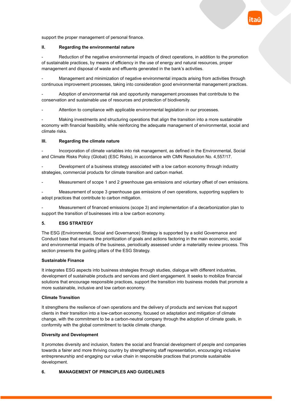 support the proper management of personal finance. II. Regarding the environmental nature - Reduction of the negative environmental impacts of direct operations, in addition to the promotion of sustainable practices, by means of efficiency in the use of energy and natural resources, proper management and disposal of waste and effluents generated in the bank’s activities. - Management and minimization of negative environmental impacts arising from activities through continuous improvement processes, taking into consideration good environmental management practices. - Adoption of environmental risk and opportunity management processes that contribute to the conservation and sustainable use of resources and protection of biodiversity. - Attention to compliance with applicable environmental legislation in our processes. - Making investments and structuring operations that align the transition into a more sustainable economy with financial feasibility, while reinforcing the adequate management of environmental, social and climate risks. III. Regarding the climate nature - Incorporation of climate variables into risk management, as defined in the Environmental, Social and Climate Risks Policy (Global) (ESC Risks), in accordance with CMN Resolution No. 4,557/17. - Development of a business strategy associated with a low carbon economy through industry strategies, commercial products for climate transition and carbon market. - Measurement of scope 1 and 2 greenhouse gas emissions and voluntary offset of own emissions. - Measurement of scope 3 greenhouse gas emissions of own operations, supporting suppliers to adopt practices that contribute to carbon mitigation. - Measurement of financed emissions (scope 3) and implementation of a decarbonization plan to support the transition of businesses into a low carbon economy. 5. ESG STRATEGY The ESG (Environmental, Social and Governance) Strategy is supported by a solid Governance and Conduct base that ensures the prioritization of goals and actions factoring in the main economic, social and environmental impacts of the business, periodically assessed under a materiality review process. This section presents the guiding pillars of the ESG Strategy. Sustainable Finance It integrates ESG aspects into business strategies through studies, dialogue with different industries, development of sustainable products and services and client engagement. It seeks to mobilize financial solutions that encourage responsible practices, support the transition into business models that promote a more sustainable, inclusive and low carbon economy. Climate Transition It strengthens the resilience of own operations and the delivery of products and services that support clients in their transition into a low-carbon economy, focused on adaptation and mitigation of climate change, with the commitment to be a carbon-neutral company through the adoption of climate goals, in conformity with the global commitment to tackle climate change. Diversity and Development It promotes diversity and inclusion, fosters the social and financial development of people and companies towards a fairer and more thriving country by strengthening staff representation, encouraging inclusive entrepreneurship and engaging our value chain in responsible practices that promote sustainable development. 6. MANAGEMENT OF PRINCIPLES AND GUIDELINES