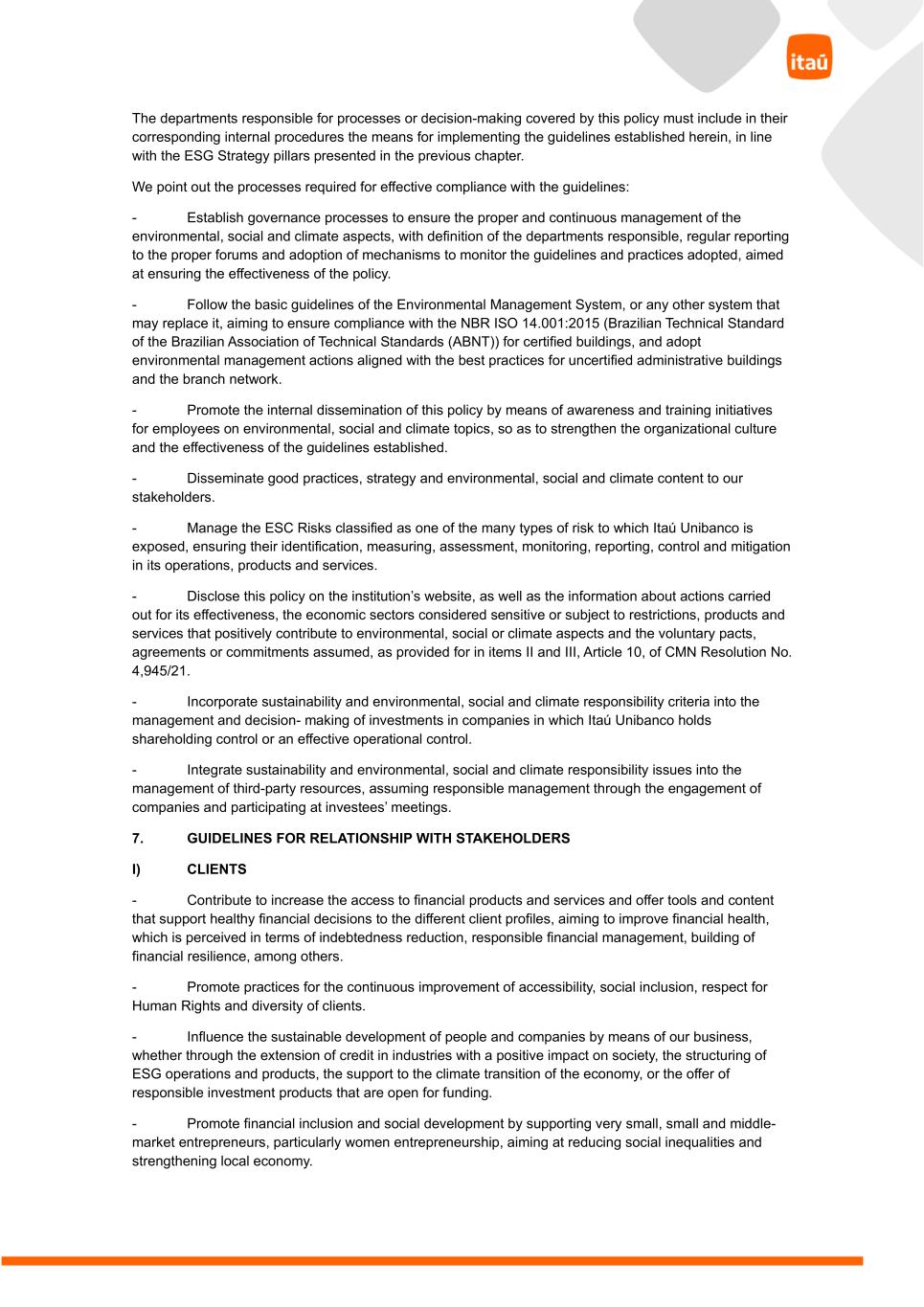 The departments responsible for processes or decision-making covered by this policy must include in their corresponding internal procedures the means for implementing the guidelines established herein, in line with the ESG Strategy pillars presented in the previous chapter. We point out the processes required for effective compliance with the guidelines: - Establish governance processes to ensure the proper and continuous management of the environmental, social and climate aspects, with definition of the departments responsible, regular reporting to the proper forums and adoption of mechanisms to monitor the guidelines and practices adopted, aimed at ensuring the effectiveness of the policy. - Follow the basic guidelines of the Environmental Management System, or any other system that may replace it, aiming to ensure compliance with the NBR ISO 14.001:2015 (Brazilian Technical Standard of the Brazilian Association of Technical Standards (ABNT)) for certified buildings, and adopt environmental management actions aligned with the best practices for uncertified administrative buildings and the branch network. - Promote the internal dissemination of this policy by means of awareness and training initiatives for employees on environmental, social and climate topics, so as to strengthen the organizational culture and the effectiveness of the guidelines established. - Disseminate good practices, strategy and environmental, social and climate content to our stakeholders. - Manage the ESC Risks classified as one of the many types of risk to which Itaú Unibanco is exposed, ensuring their identification, measuring, assessment, monitoring, reporting, control and mitigation in its operations, products and services. - Disclose this policy on the institution’s website, as well as the information about actions carried out for its effectiveness, the economic sectors considered sensitive or subject to restrictions, products and services that positively contribute to environmental, social or climate aspects and the voluntary pacts, agreements or commitments assumed, as provided for in items II and III, Article 10, of CMN Resolution No. 4,945/21. - Incorporate sustainability and environmental, social and climate responsibility criteria into the management and decision- making of investments in companies in which Itaú Unibanco holds shareholding control or an effective operational control. - Integrate sustainability and environmental, social and climate responsibility issues into the management of third-party resources, assuming responsible management through the engagement of companies and participating at investees’ meetings. 7. GUIDELINES FOR RELATIONSHIP WITH STAKEHOLDERS I) CLIENTS - Contribute to increase the access to financial products and services and offer tools and content that support healthy financial decisions to the different client profiles, aiming to improve financial health, which is perceived in terms of indebtedness reduction, responsible financial management, building of financial resilience, among others. - Promote practices for the continuous improvement of accessibility, social inclusion, respect for Human Rights and diversity of clients. - Influence the sustainable development of people and companies by means of our business, whether through the extension of credit in industries with a positive impact on society, the structuring of ESG operations and products, the support to the climate transition of the economy, or the offer of responsible investment products that are open for funding. - Promote financial inclusion and social development by supporting very small, small and middle- market entrepreneurs, particularly women entrepreneurship, aiming at reducing social inequalities and strengthening local economy.