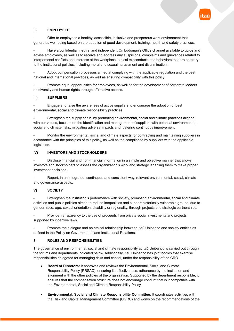 II) EMPLOYEES - Offer to employees a healthy, accessible, inclusive and prosperous work environment that generates well-being based on the adoption of good development, training, health and safety practices. - Have a confidential, neutral and independent Ombudsman’s Office channel available to guide and advise employees, as well as to receive and address any suspicions, complaints and grievances related to interpersonal conflicts and interests at the workplace, ethical misconducts and behaviors that are contrary to the institutional policies, including moral and sexual harassment and discrimination. - Adopt compensation processes aimed at complying with the applicable regulation and the best national and international practices, as well as ensuring compatibility with this policy. - Promote equal opportunities for employees, as well as for the development of corporate leaders on diversity and human rights through affirmative actions. III) SUPPLIERS - Engage and raise the awareness of active suppliers to encourage the adoption of best environmental, social and climate responsibility practices. - Strengthen the supply chain, by promoting environmental, social and climate practices aligned with our values, focused on the identification and management of suppliers with potential environmental, social and climate risks, mitigating adverse impacts and fostering continuous improvement. - Monitor the environmental, social and climate aspects for contracting and maintaining suppliers in accordance with the principles of this policy, as well as the compliance by suppliers with the applicable legislation. IV) INVESTORS AND STOCKHOLDERS - Disclose financial and non-financial information in a simple and objective manner that allows investors and stockholders to assess the organization’s work and strategy, enabling them to make proper investment decisions. - Report, in an integrated, continuous and consistent way, relevant environmental, social, climate and governance aspects. V) SOCIETY - Strengthen the institution’s performance with society, promoting environmental, social and climate activities and public policies aimed to reduce inequalities and support historically vulnerable groups, due to gender, race, age, sexual orientation, disability or regionality, through projects and strategic partnerships. - Provide transparency to the use of proceeds from private social investments and projects supported by incentive laws. - Promote the dialogue and an ethical relationship between Itaú Unibanco and society entities as defined in the Policy on Governmental and Institutional Relations. 8. ROLES AND RESPONSIBILITIES The governance of environmental, social and climate responsibility at Itaú Unibanco is carried out through the forums and departments indicated below. Additionally, Itaú Unibanco has joint bodies that exercise responsibilities delegated for managing risks and capital, under the responsibility of the CRO. • Board of Directors: It approves and reviews the Environmental, Social and Climate Responsibility Policy (PRSAC), ensuring its effectiveness, adherence by the institution and alignment with the other policies of the organization. Supported by the department responsible, it ensures that the compensation structure does not encourage conduct that is incompatible with the Environmental, Social and Climate Responsibility Policy. • Environmental, Social and Climate Responsibility Committee: It coordinates activities with the Risk and Capital Management Committee (CGRC) and works on the recommendations of the