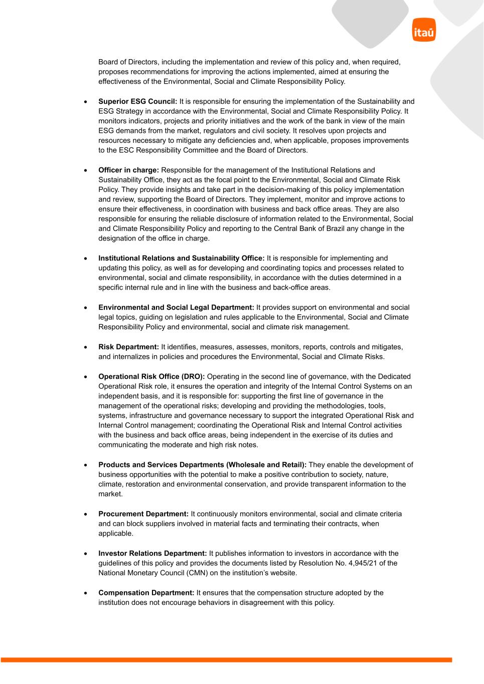 Board of Directors, including the implementation and review of this policy and, when required, proposes recommendations for improving the actions implemented, aimed at ensuring the effectiveness of the Environmental, Social and Climate Responsibility Policy. • Superior ESG Council: It is responsible for ensuring the implementation of the Sustainability and ESG Strategy in accordance with the Environmental, Social and Climate Responsibility Policy. It monitors indicators, projects and priority initiatives and the work of the bank in view of the main ESG demands from the market, regulators and civil society. It resolves upon projects and resources necessary to mitigate any deficiencies and, when applicable, proposes improvements to the ESC Responsibility Committee and the Board of Directors. • Officer in charge: Responsible for the management of the Institutional Relations and Sustainability Office, they act as the focal point to the Environmental, Social and Climate Risk Policy. They provide insights and take part in the decision-making of this policy implementation and review, supporting the Board of Directors. They implement, monitor and improve actions to ensure their effectiveness, in coordination with business and back office areas. They are also responsible for ensuring the reliable disclosure of information related to the Environmental, Social and Climate Responsibility Policy and reporting to the Central Bank of Brazil any change in the designation of the office in charge. • Institutional Relations and Sustainability Office: It is responsible for implementing and updating this policy, as well as for developing and coordinating topics and processes related to environmental, social and climate responsibility, in accordance with the duties determined in a specific internal rule and in line with the business and back-office areas. • Environmental and Social Legal Department: It provides support on environmental and social legal topics, guiding on legislation and rules applicable to the Environmental, Social and Climate Responsibility Policy and environmental, social and climate risk management. • Risk Department: It identifies, measures, assesses, monitors, reports, controls and mitigates, and internalizes in policies and procedures the Environmental, Social and Climate Risks. • Operational Risk Office (DRO): Operating in the second line of governance, with the Dedicated Operational Risk role, it ensures the operation and integrity of the Internal Control Systems on an independent basis, and it is responsible for: supporting the first line of governance in the management of the operational risks; developing and providing the methodologies, tools, systems, infrastructure and governance necessary to support the integrated Operational Risk and Internal Control management; coordinating the Operational Risk and Internal Control activities with the business and back office areas, being independent in the exercise of its duties and communicating the moderate and high risk notes. • Products and Services Departments (Wholesale and Retail): They enable the development of business opportunities with the potential to make a positive contribution to society, nature, climate, restoration and environmental conservation, and provide transparent information to the market. • Procurement Department: It continuously monitors environmental, social and climate criteria and can block suppliers involved in material facts and terminating their contracts, when applicable. • Investor Relations Department: It publishes information to investors in accordance with the guidelines of this policy and provides the documents listed by Resolution No. 4,945/21 of the National Monetary Council (CMN) on the institution’s website. • Compensation Department: It ensures that the compensation structure adopted by the institution does not encourage behaviors in disagreement with this policy.