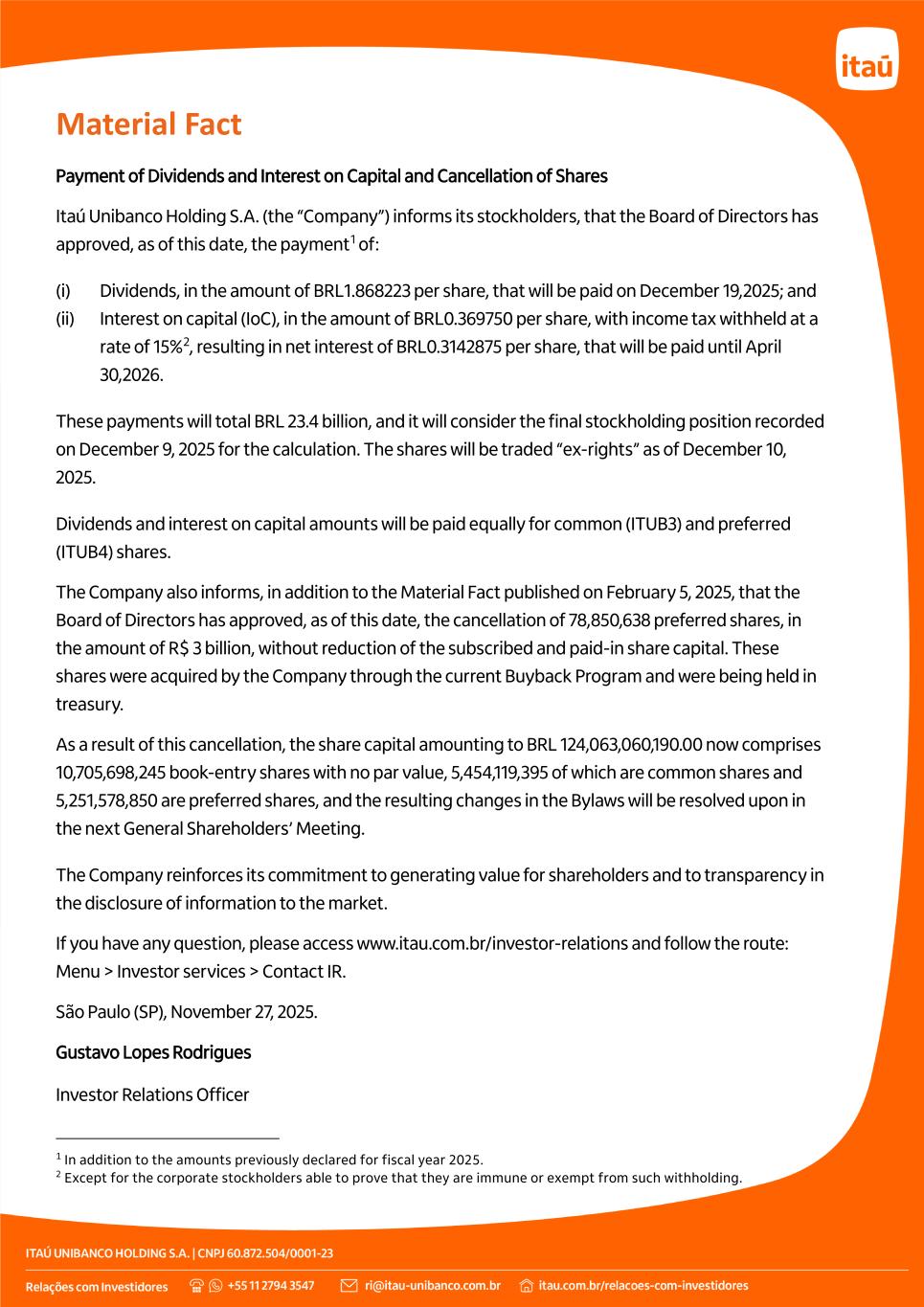 Material Fact Payment of Dividends and Interest on Capital and Cancellation of Shares Itaú Unibanco Holding S.A. (the “Company”) informs its stockholders, that the Board of Directors has approved, as of this date, the payment1 of: (i) Dividends, in the amount of BRL1.868223 per share, that will be paid on December 19,2025; and (ii) Interest on capital (IoC), in the amount of BRL0.369750 per share, with income tax withheld at a rate of 15%2, resulting in net interest of BRL0.3142875 per share, that will be paid until April 30,2026. These payments will total BRL 23.4 billion, and it will consider the final stockholding position recorded on December 9, 2025 for the calculation. The shares will be traded “ex-rights” as of December 10, 2025. Dividends and interest on capital amounts will be paid equally for common (ITUB3) and preferred (ITUB4) shares. The Company also informs, in addition to the Material Fact published on February 5, 2025, that the Board of Directors has approved, as of this date, the cancellation of 78,850,638 preferred shares, in the amount of R$ 3 billion, without reduction of the subscribed and paid-in share capital. These shares were acquired by the Company through the current Buyback Program and were being held in treasury. As a result of this cancellation, the share capital amounting to BRL 124,063,060,190.00 now comprises 10,705,698,245 book-entry shares with no par value, 5,454,119,395 of which are common shares and 5,251,578,850 are preferred shares, and the resulting changes in the Bylaws will be resolved upon in the next General Shareholders’ Meeting. The Company reinforces its commitment to generating value for shareholders and to transparency in the disclosure of information to the market. If you have any question, please access www.itau.com.br/investor-relations and follow the route: Menu > Investor services > Contact IR. São Paulo (SP), November 27, 2025. Gustavo Lopes Rodrigues Investor Relations Officer 1 In addition to the amounts previously declared for fiscal year 2025. 2 Except for the corporate stockholders able to prove that they are immune or exempt from such withholding.