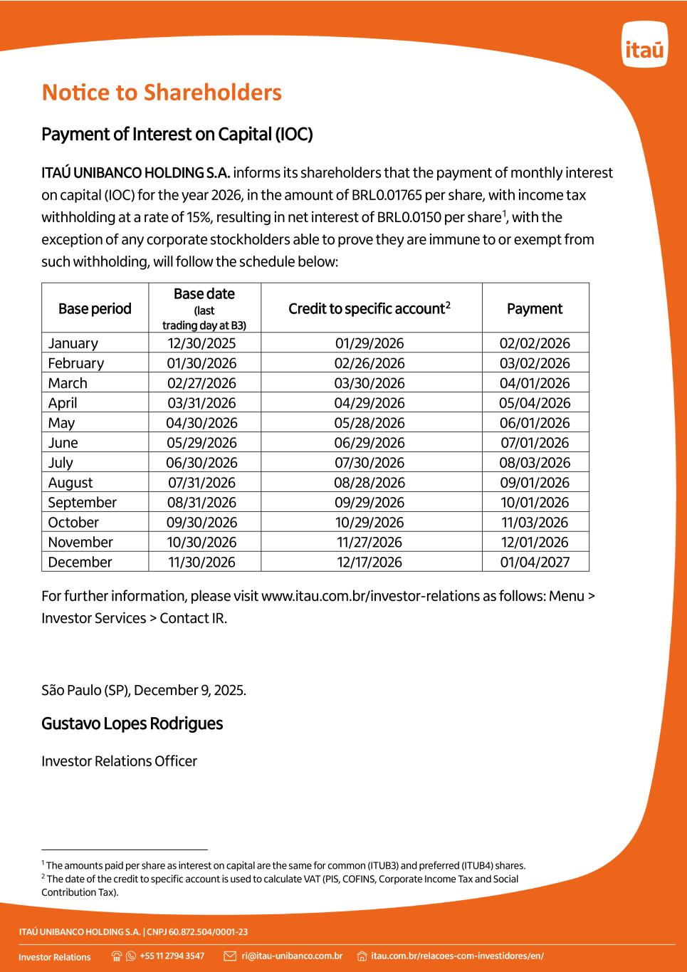 Notice to Shareholders Payment of Interest on Capital (IOC) ITAÚ UNIBANCO HOLDING S.A. informs its shareholders that the payment of monthly interest on capital (IOC) for the year 2026, in the amount of BRL0.01765 per share, with income tax withholding at a rate of 15%, resulting in net interest of BRL0.0150 per share1, with the exception of any corporate stockholders able to prove they are immune to or exempt from such withholding, will follow the schedule below: Base period Base date (last trading day at B3) Credit to specific account2 Payment January 12/30/2025 01/29/2026 02/02/2026 February 01/30/2026 02/26/2026 03/02/2026 March 02/27/2026 03/30/2026 04/01/2026 April 03/31/2026 04/29/2026 05/04/2026 May 04/30/2026 05/28/2026 06/01/2026 June 05/29/2026 06/29/2026 07/01/2026 July 06/30/2026 07/30/2026 08/03/2026 August 07/31/2026 08/28/2026 09/01/2026 September 08/31/2026 09/29/2026 10/01/2026 October 09/30/2026 10/29/2026 11/03/2026 November 10/30/2026 11/27/2026 12/01/2026 December 11/30/2026 12/17/2026 01/04/2027 For further information, please visit www.itau.com.br/investor-relations as follows: Menu > Investor Services > Contact IR. São Paulo (SP), December 9, 2025. Gustavo Lopes Rodrigues Investor Relations Officer 1 The amounts paid per share as interest on capital are the same for common (ITUB3) and preferred (ITUB4) shares. 2 The date of the credit to specific account is used to calculate VAT (PIS, COFINS, Corporate Income Tax and Social Contribution Tax).