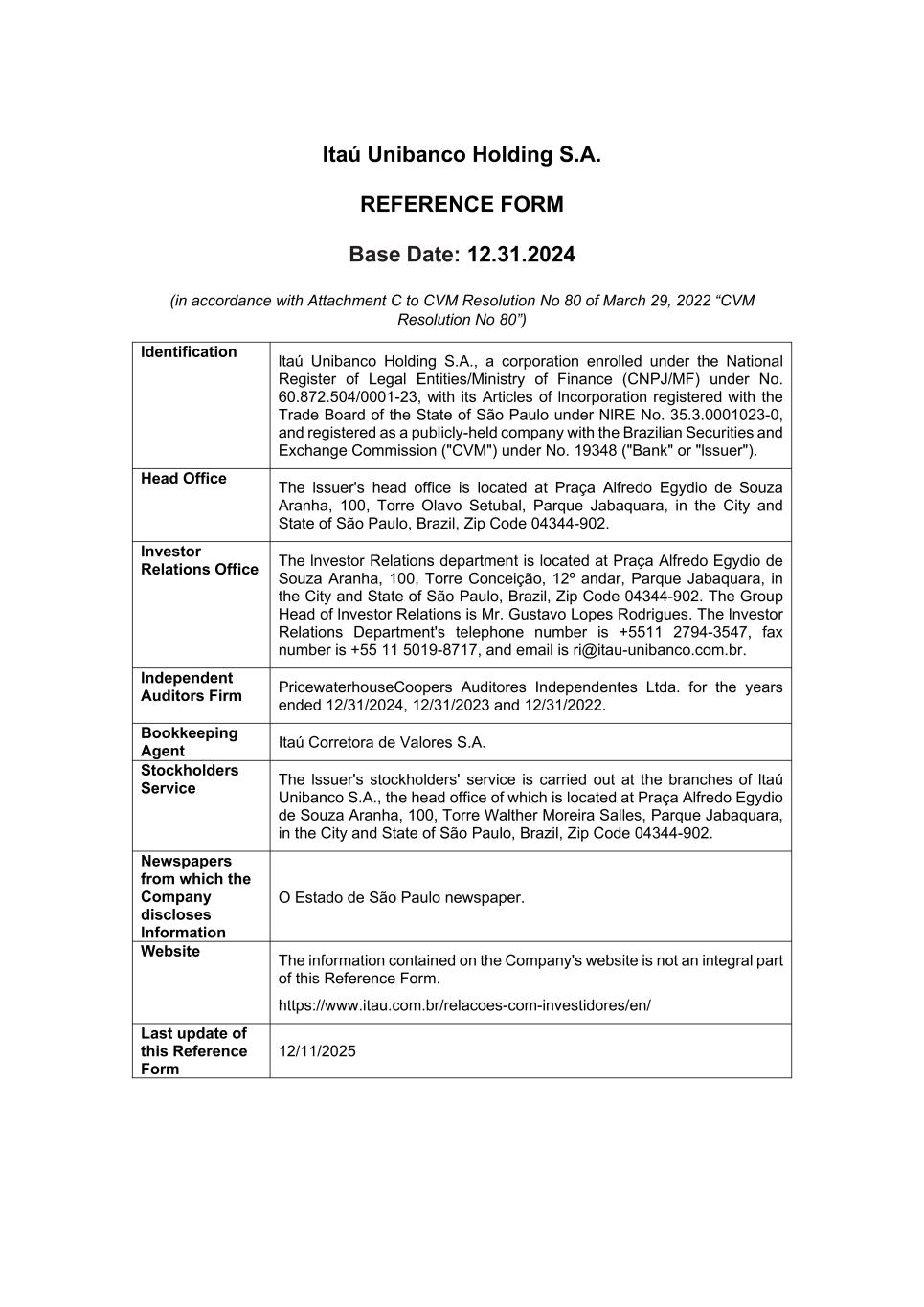 Itaú Unibanco Holding S.A. REFERENCE FORM Base Date: 12.31.2024 (in accordance with Attachment C to CVM Resolution No 80 of March 29, 2022 “CVM Resolution No 80”) Identification ltaú Unibanco Holding S.A., a corporation enrolled under the National Register of Legal Entities/Ministry of Finance (CNPJ/MF) under No. 60.872.504/0001-23, with its Articles of lncorporation registered with the Trade Board of the State of São Paulo under NlRE No. 35.3.0001023-0, and registered as a publicly-held company with the Brazilian Securities and Exchange Commission ("CVM") under No. 19348 ("Bank" or "lssuer"). Head Office The lssuer's head office is located at Praça Alfredo Egydio de Souza Aranha, 100, Torre Olavo Setubal, Parque Jabaquara, in the City and State of São Paulo, Brazil, Zip Code 04344-902. Investor Relations Office The lnvestor Relations department is located at Praça Alfredo Egydio de Souza Aranha, 100, Torre Conceição, 12º andar, Parque Jabaquara, in the City and State of São Paulo, Brazil, Zip Code 04344-902. The Group Head of lnvestor Relations is Mr. Gustavo Lopes Rodrigues. The lnvestor Relations Department's telephone number is +5511 2794-3547, fax number is +55 11 5019-8717, and email is ri@itau-unibanco.com.br. lndependent Auditors Firm PricewaterhouseCoopers Auditores Independentes Ltda. for the years ended 12/31/2024, 12/31/2023 and 12/31/2022. Bookkeeping Agent Itaú Corretora de Valores S.A. Stockholders Service The lssuer's stockholders' service is carried out at the branches of ltaú Unibanco S.A., the head office of which is located at Praça Alfredo Egydio de Souza Aranha, 100, Torre Walther Moreira Salles, Parque Jabaquara, in the City and State of São Paulo, Brazil, Zip Code 04344-902. Newspapers from which the Company discloses lnformation O Estado de São Paulo newspaper. Website The information contained on the Company's website is not an integral part of this Reference Form. https://www.itau.com.br/relacoes-com-investidores/en/ Last update of this Reference Form 12/11/2025