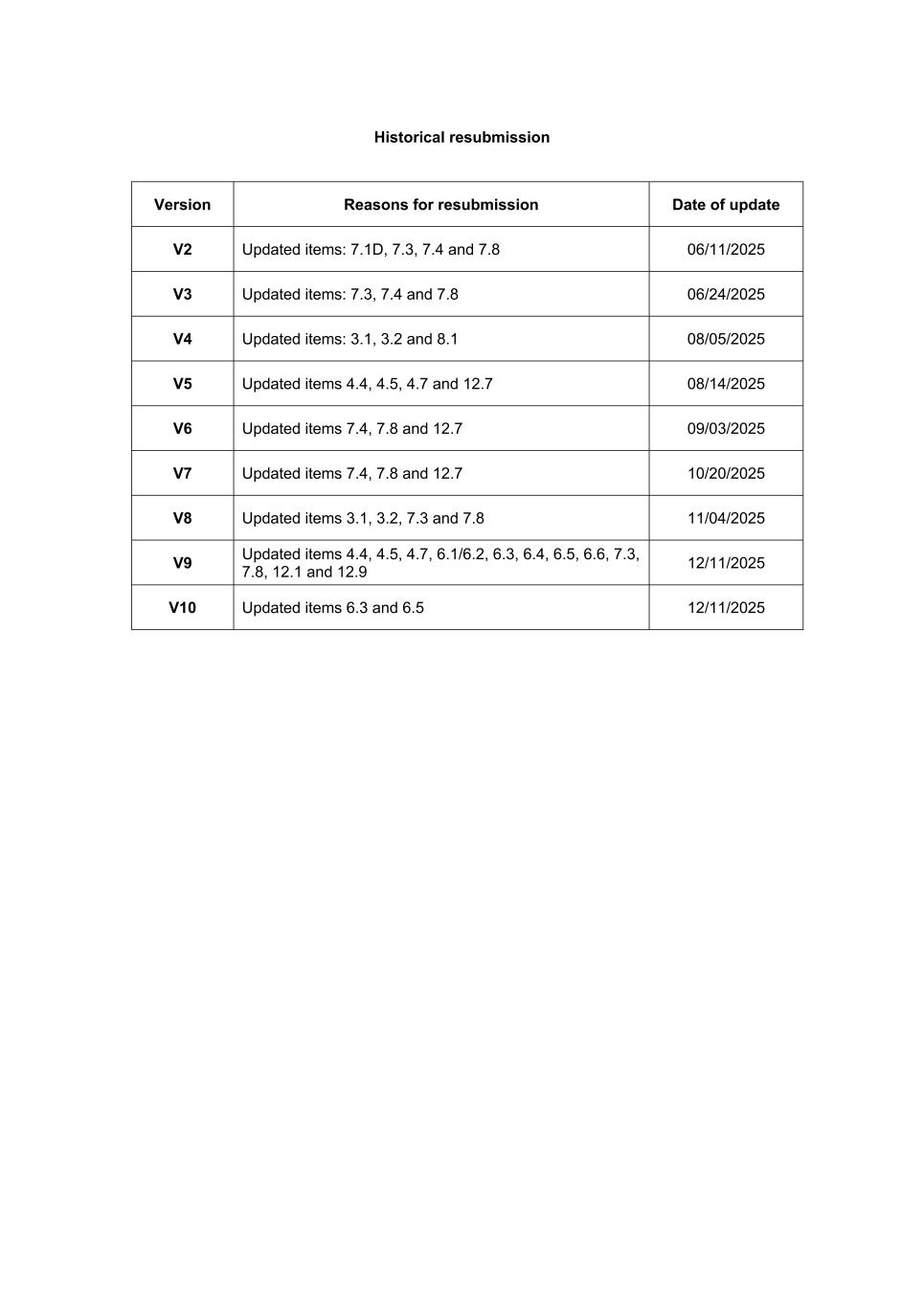 Historical resubmission Version Reasons for resubmission Date of update V2 Updated items: 7.1D, 7.3, 7.4 and 7.8 06/11/2025 V3 Updated items: 7.3, 7.4 and 7.8 06/24/2025 V4 Updated items: 3.1, 3.2 and 8.1 08/05/2025 V5 Updated items 4.4, 4.5, 4.7 and 12.7 08/14/2025 V6 Updated items 7.4, 7.8 and 12.7 09/03/2025 V7 Updated items 7.4, 7.8 and 12.7 10/20/2025 V8 Updated items 3.1, 3.2, 7.3 and 7.8 11/04/2025 V9 Updated items 4.4, 4.5, 4.7, 6.1/6.2, 6.3, 6.4, 6.5, 6.6, 7.3, 7.8, 12.1 and 12.9 12/11/2025 V10 Updated items 6.3 and 6.5 12/11/2025