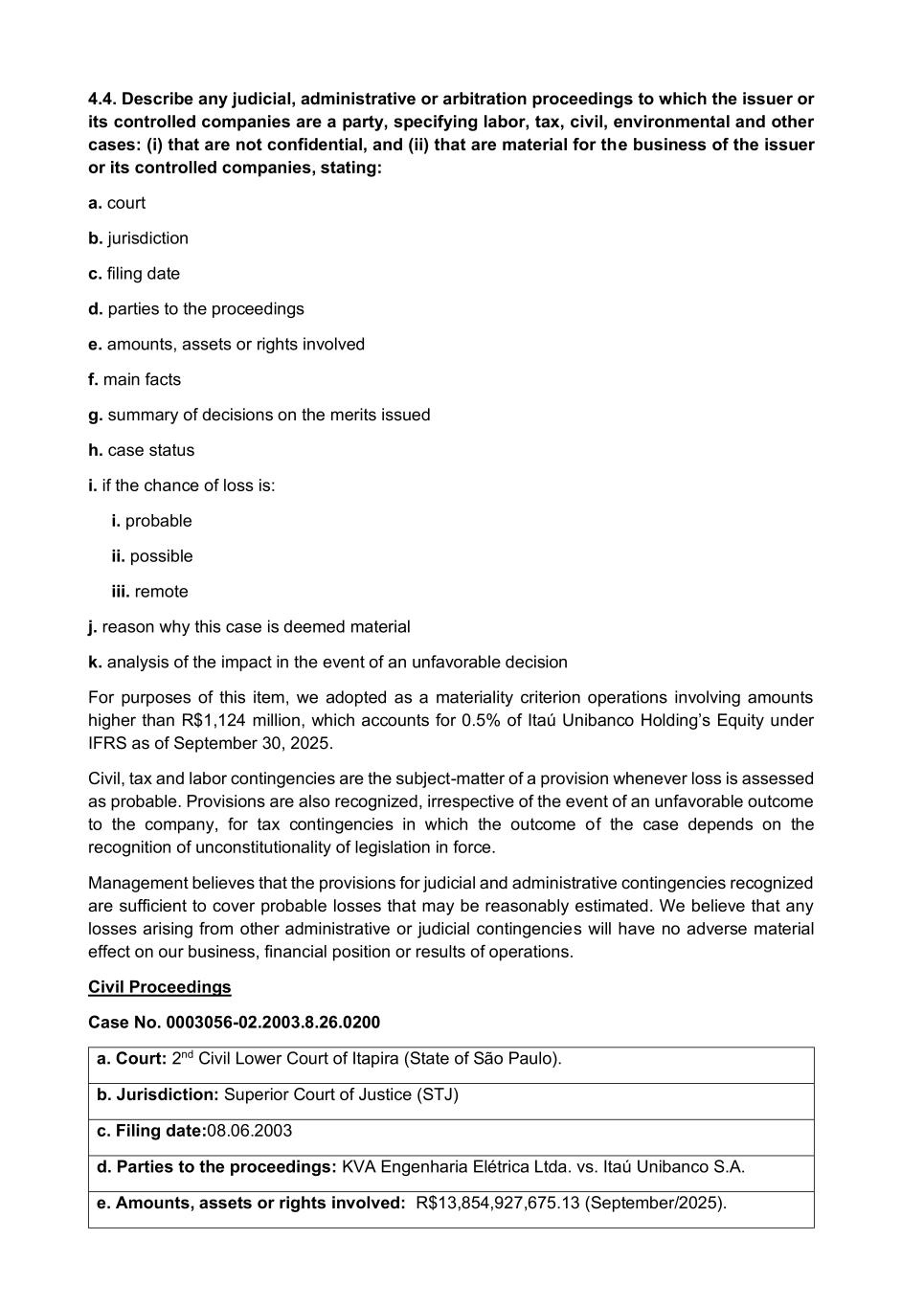 4.4. Describe any judicial, administrative or arbitration proceedings to which the issuer or its controlled companies are a party, specifying labor, tax, civil, environmental and other cases: (i) that are not confidential, and (ii) that are material for the business of the issuer or its controlled companies, stating: a. court b. jurisdiction c. filing date d. parties to the proceedings e. amounts, assets or rights involved f. main facts g. summary of decisions on the merits issued h. case status i. if the chance of loss is: i. probable ii. possible iii. remote j. reason why this case is deemed material k. analysis of the impact in the event of an unfavorable decision For purposes of this item, we adopted as a materiality criterion operations involving amounts higher than R$1,124 million, which accounts for 0.5% of Itaú Unibanco Holding’s Equity under IFRS as of September 30, 2025. Civil, tax and labor contingencies are the subject-matter of a provision whenever loss is assessed as probable. Provisions are also recognized, irrespective of the event of an unfavorable outcome to the company, for tax contingencies in which the outcome of the case depends on the recognition of unconstitutionality of legislation in force. Management believes that the provisions for judicial and administrative contingencies recognized are sufficient to cover probable losses that may be reasonably estimated. We believe that any losses arising from other administrative or judicial contingencies will have no adverse material effect on our business, financial position or results of operations. Civil Proceedings Case No. 0003056-02.2003.8.26.0200 a. Court: 2nd Civil Lower Court of Itapira (State of São Paulo). b. Jurisdiction: Superior Court of Justice (STJ) c. Filing date:08.06.2003 d. Parties to the proceedings: KVA Engenharia Elétrica Ltda. vs. Itaú Unibanco S.A. e. Amounts, assets or rights involved: R$13,854,927,675.13 (September/2025).