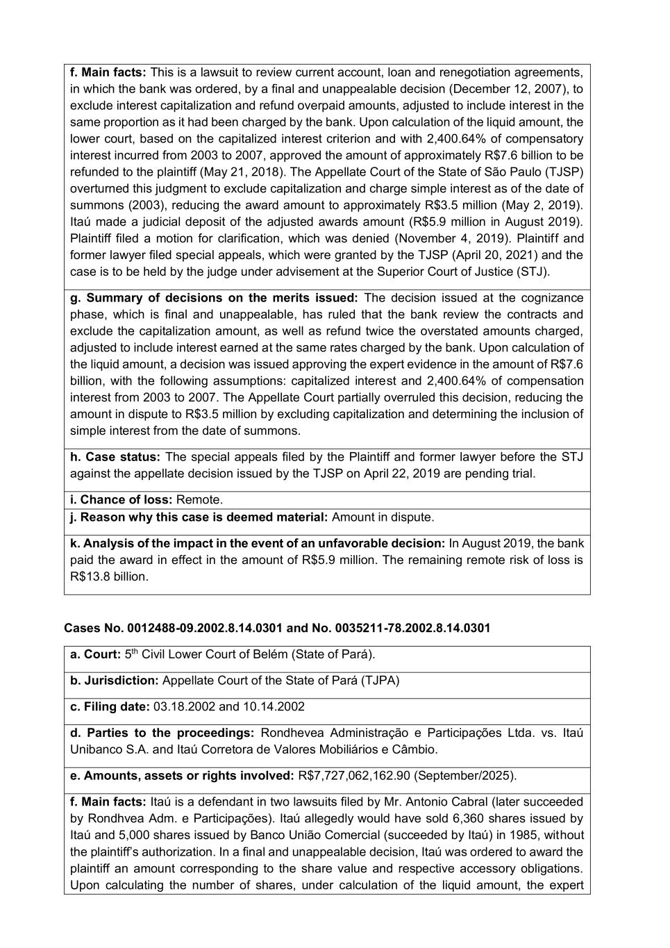 f. Main facts: This is a lawsuit to review current account, loan and renegotiation agreements, in which the bank was ordered, by a final and unappealable decision (December 12, 2007), to exclude interest capitalization and refund overpaid amounts, adjusted to include interest in the same proportion as it had been charged by the bank. Upon calculation of the liquid amount, the lower court, based on the capitalized interest criterion and with 2,400.64% of compensatory interest incurred from 2003 to 2007, approved the amount of approximately R$7.6 billion to be refunded to the plaintiff (May 21, 2018). The Appellate Court of the State of São Paulo (TJSP) overturned this judgment to exclude capitalization and charge simple interest as of the date of summons (2003), reducing the award amount to approximately R$3.5 million (May 2, 2019). Itaú made a judicial deposit of the adjusted awards amount (R$5.9 million in August 2019). Plaintiff filed a motion for clarification, which was denied (November 4, 2019). Plaintiff and former lawyer filed special appeals, which were granted by the TJSP (April 20, 2021) and the case is to be held by the judge under advisement at the Superior Court of Justice (STJ). g. Summary of decisions on the merits issued: The decision issued at the cognizance phase, which is final and unappealable, has ruled that the bank review the contracts and exclude the capitalization amount, as well as refund twice the overstated amounts charged, adjusted to include interest earned at the same rates charged by the bank. Upon calculation of the liquid amount, a decision was issued approving the expert evidence in the amount of R$7.6 billion, with the following assumptions: capitalized interest and 2,400.64% of compensation interest from 2003 to 2007. The Appellate Court partially overruled this decision, reducing the amount in dispute to R$3.5 million by excluding capitalization and determining the inclusion of simple interest from the date of summons. h. Case status: The special appeals filed by the Plaintiff and former lawyer before the STJ against the appellate decision issued by the TJSP on April 22, 2019 are pending trial. i. Chance of loss: Remote. j. Reason why this case is deemed material: Amount in dispute. k. Analysis of the impact in the event of an unfavorable decision: In August 2019, the bank paid the award in effect in the amount of R$5.9 million. The remaining remote risk of loss is R$13.8 billion. Cases No. 0012488-09.2002.8.14.0301 and No. 0035211-78.2002.8.14.0301 a. Court: 5th Civil Lower Court of Belém (State of Pará). b. Jurisdiction: Appellate Court of the State of Pará (TJPA) c. Filing date: 03.18.2002 and 10.14.2002 d. Parties to the proceedings: Rondhevea Administração e Participações Ltda. vs. Itaú Unibanco S.A. and Itaú Corretora de Valores Mobiliários e Câmbio. e. Amounts, assets or rights involved: R$7,727,062,162.90 (September/2025). f. Main facts: Itaú is a defendant in two lawsuits filed by Mr. Antonio Cabral (later succeeded by Rondhvea Adm. e Participações). Itaú allegedly would have sold 6,360 shares issued by Itaú and 5,000 shares issued by Banco União Comercial (succeeded by Itaú) in 1985, without the plaintiff’s authorization. In a final and unappealable decision, Itaú was ordered to award the plaintiff an amount corresponding to the share value and respective accessory obligations. Upon calculating the number of shares, under calculation of the liquid amount, the expert