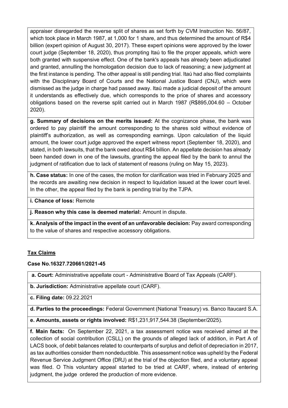 appraiser disregarded the reverse split of shares as set forth by CVM Instruction No. 56/87, which took place in March 1987, at 1,000 for 1 share, and thus determined the amount of R$4 billion (expert opinion of August 30, 2017). These expert opinions were approved by the lower court judge (September 18, 2020), thus prompting Itaú to file the proper appeals, which were both granted with suspensive effect. One of the bank's appeals has already been adjudicated and granted, annulling the homologation decision due to lack of reasoning; a new judgment at the first instance is pending. The other appeal is still pending trial. Itaú had also filed complaints with the Disciplinary Board of Courts and the National Justice Board (CNJ), which were dismissed as the judge in charge had passed away. Itaú made a judicial deposit of the amount it understands as effectively due, which corresponds to the price of shares and accessory obligations based on the reverse split carried out in March 1987 (R$895,004.60 – October 2020). g. Summary of decisions on the merits issued: At the cognizance phase, the bank was ordered to pay plaintiff the amount corresponding to the shares sold without evidence of plaintiff’s authorization, as well as corresponding earnings. Upon calculation of the liquid amount, the lower court judge approved the expert witness report (September 18, 2020), and stated, in both lawsuits, that the bank owed about R$4 billion. An appellate decision has already been handed down in one of the lawsuits, granting the appeal filed by the bank to annul the judgment of ratification due to lack of statement of reasons (ruling on May 15, 2023). h. Case status: In one of the cases, the motion for clarification was tried in February 2025 and the records are awaiting new decision in respect to liquidation issued at the lower court level. In the other, the appeal filed by the bank is pending trial by the TJPA. i. Chance of loss: Remote j. Reason why this case is deemed material: Amount in dispute. k. Analysis of the impact in the event of an unfavorable decision: Pay award corresponding to the value of shares and respective accessory obligations. Tax Claims Case No.16327.720661/2021-45 a. Court: Administrative appellate court - Administrative Board of Tax Appeals (CARF). b. Jurisdiction: Administrative appellate court (CARF). c. Filing date: 09.22.2021 d. Parties to the proceedings: Federal Government (National Treasury) vs. Banco Itaucard S.A. e. Amounts, assets or rights involved: R$1,231,917,544.38 (September/2025). f. Main facts: On September 22, 2021, a tax assessment notice was received aimed at the collection of social contribution (CSLL) on the grounds of alleged lack of addition, in Part A of LACS book, of debit balances related to counterparts of surplus and deficit of depreciation in 2017, as tax authorities consider them nondeductible. This assessment notice was upheld by the Federal Revenue Service Judgment Office (DRJ) at the trial of the objection filed, and a voluntary appeal was filed. O This voluntary appeal started to be tried at CARF, where, instead of entering judgment, the judge ordered the production of more evidence.