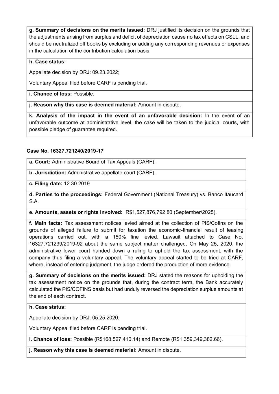 g. Summary of decisions on the merits issued: DRJ justified its decision on the grounds that the adjustments arising from surplus and deficit of depreciation cause no tax effects on CSLL, and should be neutralized off books by excluding or adding any corresponding revenues or expenses in the calculation of the contribution calculation basis. h. Case status: Appellate decision by DRJ: 09.23.2022; Voluntary Appeal filed before CARF is pending trial. i. Chance of loss: Possible. j. Reason why this case is deemed material: Amount in dispute. k. Analysis of the impact in the event of an unfavorable decision: In the event of an unfavorable outcome at administrative level, the case will be taken to the judicial courts, with possible pledge of guarantee required. Case No. 16327.721240/2019-17 a. Court: Administrative Board of Tax Appeals (CARF). b. Jurisdiction: Administrative appellate court (CARF). c. Filing date: 12.30.2019 d. Parties to the proceedings: Federal Government (National Treasury) vs. Banco Itaucard S.A. e. Amounts, assets or rights involved: R$1,527,876,792.80 (September/2025). f. Main facts: Tax assessment notices levied aimed at the collection of PIS/Cofins on the grounds of alleged failure to submit for taxation the economic-financial result of leasing operations carried out, with a 150% fine levied. Lawsuit attached to Case No. 16327.721239/2019-92 about the same subject matter challenged. On May 25, 2020, the administrative lower court handed down a ruling to uphold the tax assessment, with the company thus filing a voluntary appeal. The voluntary appeal started to be tried at CARF, where, instead of entering judgment, the judge ordered the production of more evidence. g. Summary of decisions on the merits issued: DRJ stated the reasons for upholding the tax assessment notice on the grounds that, during the contract term, the Bank accurately calculated the PIS/COFINS basis but had unduly reversed the depreciation surplus amounts at the end of each contract. h. Case status: Appellate decision by DRJ: 05.25.2020; Voluntary Appeal filed before CARF is pending trial. i. Chance of loss: Possible (R$168,527,410.14) and Remote (R$1,359,349,382.66). j. Reason why this case is deemed material: Amount in dispute.