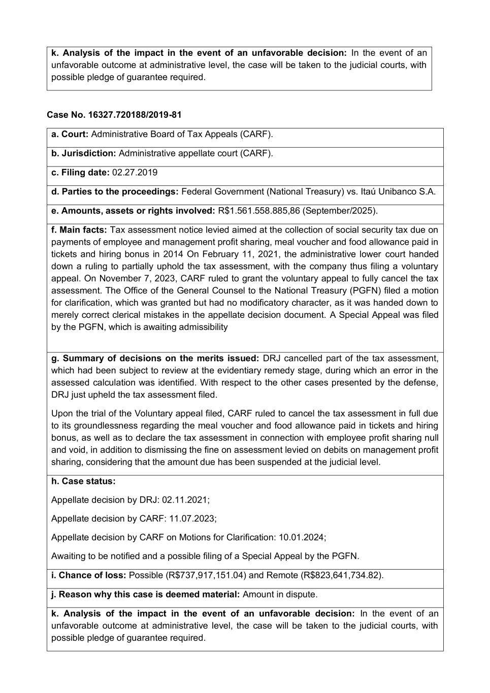 k. Analysis of the impact in the event of an unfavorable decision: In the event of an unfavorable outcome at administrative level, the case will be taken to the judicial courts, with possible pledge of guarantee required. Case No. 16327.720188/2019-81 a. Court: Administrative Board of Tax Appeals (CARF). b. Jurisdiction: Administrative appellate court (CARF). c. Filing date: 02.27.2019 d. Parties to the proceedings: Federal Government (National Treasury) vs. Itaú Unibanco S.A. e. Amounts, assets or rights involved: R$1.561.558.885,86 (September/2025). f. Main facts: Tax assessment notice levied aimed at the collection of social security tax due on payments of employee and management profit sharing, meal voucher and food allowance paid in tickets and hiring bonus in 2014 On February 11, 2021, the administrative lower court handed down a ruling to partially uphold the tax assessment, with the company thus filing a voluntary appeal. On November 7, 2023, CARF ruled to grant the voluntary appeal to fully cancel the tax assessment. The Office of the General Counsel to the National Treasury (PGFN) filed a motion for clarification, which was granted but had no modificatory character, as it was handed down to merely correct clerical mistakes in the appellate decision document. A Special Appeal was filed by the PGFN, which is awaiting admissibility g. Summary of decisions on the merits issued: DRJ cancelled part of the tax assessment, which had been subject to review at the evidentiary remedy stage, during which an error in the assessed calculation was identified. With respect to the other cases presented by the defense, DRJ just upheld the tax assessment filed. Upon the trial of the Voluntary appeal filed, CARF ruled to cancel the tax assessment in full due to its groundlessness regarding the meal voucher and food allowance paid in tickets and hiring bonus, as well as to declare the tax assessment in connection with employee profit sharing null and void, in addition to dismissing the fine on assessment levied on debits on management profit sharing, considering that the amount due has been suspended at the judicial level. h. Case status: Appellate decision by DRJ: 02.11.2021; Appellate decision by CARF: 11.07.2023; Appellate decision by CARF on Motions for Clarification: 10.01.2024; Awaiting to be notified and a possible filing of a Special Appeal by the PGFN. i. Chance of loss: Possible (R$737,917,151.04) and Remote (R$823,641,734.82). j. Reason why this case is deemed material: Amount in dispute. k. Analysis of the impact in the event of an unfavorable decision: In the event of an unfavorable outcome at administrative level, the case will be taken to the judicial courts, with possible pledge of guarantee required.