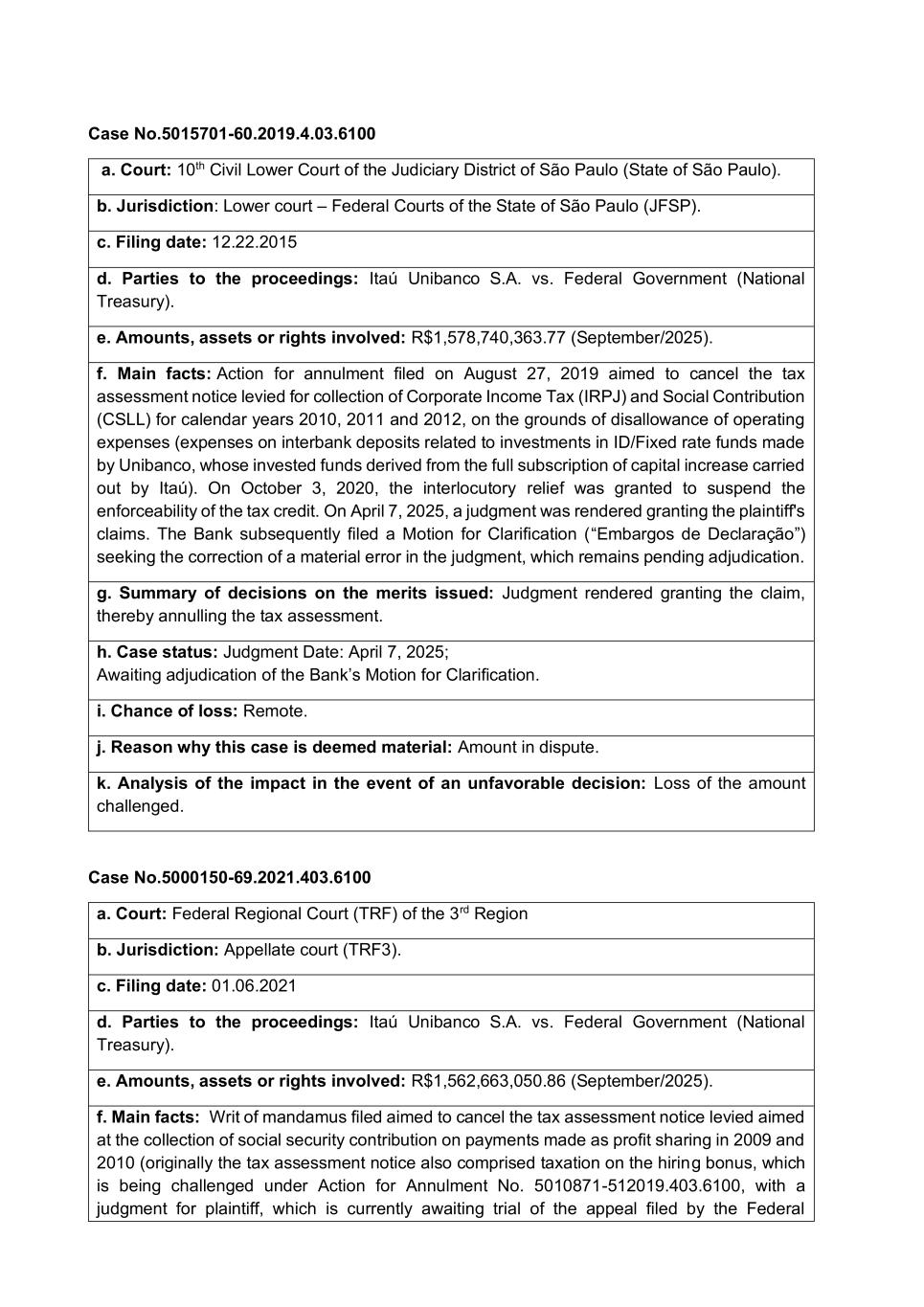 Case No.5015701-60.2019.4.03.6100 a. Court: 10th Civil Lower Court of the Judiciary District of São Paulo (State of São Paulo). b. Jurisdiction: Lower court – Federal Courts of the State of São Paulo (JFSP). c. Filing date: 12.22.2015 d. Parties to the proceedings: Itaú Unibanco S.A. vs. Federal Government (National Treasury). e. Amounts, assets or rights involved: R$1,578,740,363.77 (September/2025). f. Main facts: Action for annulment filed on August 27, 2019 aimed to cancel the tax assessment notice levied for collection of Corporate Income Tax (IRPJ) and Social Contribution (CSLL) for calendar years 2010, 2011 and 2012, on the grounds of disallowance of operating expenses (expenses on interbank deposits related to investments in ID/Fixed rate funds made by Unibanco, whose invested funds derived from the full subscription of capital increase carried out by Itaú). On October 3, 2020, the interlocutory relief was granted to suspend the enforceability of the tax credit. On April 7, 2025, a judgment was rendered granting the plaintiff's claims. The Bank subsequently filed a Motion for Clarification (“Embargos de Declaração”) seeking the correction of a material error in the judgment, which remains pending adjudication. g. Summary of decisions on the merits issued: Judgment rendered granting the claim, thereby annulling the tax assessment. h. Case status: Judgment Date: April 7, 2025; Awaiting adjudication of the Bank’s Motion for Clarification. i. Chance of loss: Remote. j. Reason why this case is deemed material: Amount in dispute. k. Analysis of the impact in the event of an unfavorable decision: Loss of the amount challenged. Case No.5000150-69.2021.403.6100 a. Court: Federal Regional Court (TRF) of the 3rd Region b. Jurisdiction: Appellate court (TRF3). c. Filing date: 01.06.2021 d. Parties to the proceedings: Itaú Unibanco S.A. vs. Federal Government (National Treasury). e. Amounts, assets or rights involved: R$1,562,663,050.86 (September/2025). f. Main facts: Writ of mandamus filed aimed to cancel the tax assessment notice levied aimed at the collection of social security contribution on payments made as profit sharing in 2009 and 2010 (originally the tax assessment notice also comprised taxation on the hiring bonus, which is being challenged under Action for Annulment No. 5010871-512019.403.6100, with a judgment for plaintiff, which is currently awaiting trial of the appeal filed by the Federal