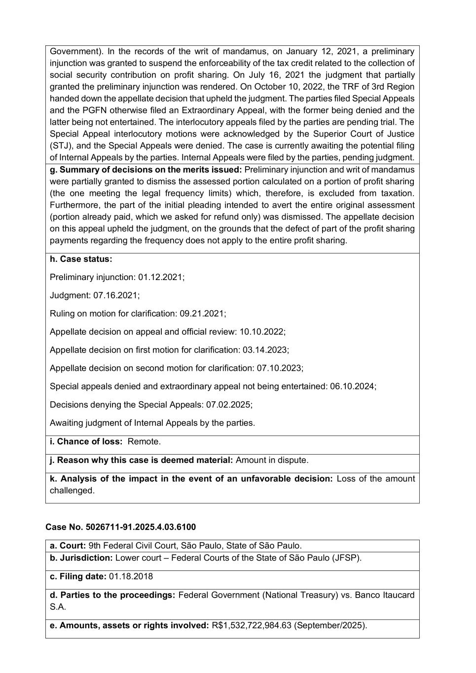 Government). In the records of the writ of mandamus, on January 12, 2021, a preliminary injunction was granted to suspend the enforceability of the tax credit related to the collection of social security contribution on profit sharing. On July 16, 2021 the judgment that partially granted the preliminary injunction was rendered. On October 10, 2022, the TRF of 3rd Region handed down the appellate decision that upheld the judgment. The parties filed Special Appeals and the PGFN otherwise filed an Extraordinary Appeal, with the former being denied and the latter being not entertained. The interlocutory appeals filed by the parties are pending trial. The Special Appeal interlocutory motions were acknowledged by the Superior Court of Justice (STJ), and the Special Appeals were denied. The case is currently awaiting the potential filing of Internal Appeals by the parties. Internal Appeals were filed by the parties, pending judgment. g. Summary of decisions on the merits issued: Preliminary injunction and writ of mandamus were partially granted to dismiss the assessed portion calculated on a portion of profit sharing (the one meeting the legal frequency limits) which, therefore, is excluded from taxation. Furthermore, the part of the initial pleading intended to avert the entire original assessment (portion already paid, which we asked for refund only) was dismissed. The appellate decision on this appeal upheld the judgment, on the grounds that the defect of part of the profit sharing payments regarding the frequency does not apply to the entire profit sharing. h. Case status: Preliminary injunction: 01.12.2021; Judgment: 07.16.2021; Ruling on motion for clarification: 09.21.2021; Appellate decision on appeal and official review: 10.10.2022; Appellate decision on first motion for clarification: 03.14.2023; Appellate decision on second motion for clarification: 07.10.2023; Special appeals denied and extraordinary appeal not being entertained: 06.10.2024; Decisions denying the Special Appeals: 07.02.2025; Awaiting judgment of Internal Appeals by the parties. i. Chance of loss: Remote. j. Reason why this case is deemed material: Amount in dispute. k. Analysis of the impact in the event of an unfavorable decision: Loss of the amount challenged. Case No. 5026711-91.2025.4.03.6100 a. Court: 9th Federal Civil Court, São Paulo, State of São Paulo. b. Jurisdiction: Lower court – Federal Courts of the State of São Paulo (JFSP). c. Filing date: 01.18.2018 d. Parties to the proceedings: Federal Government (National Treasury) vs. Banco Itaucard S.A. e. Amounts, assets or rights involved: R$1,532,722,984.63 (September/2025).