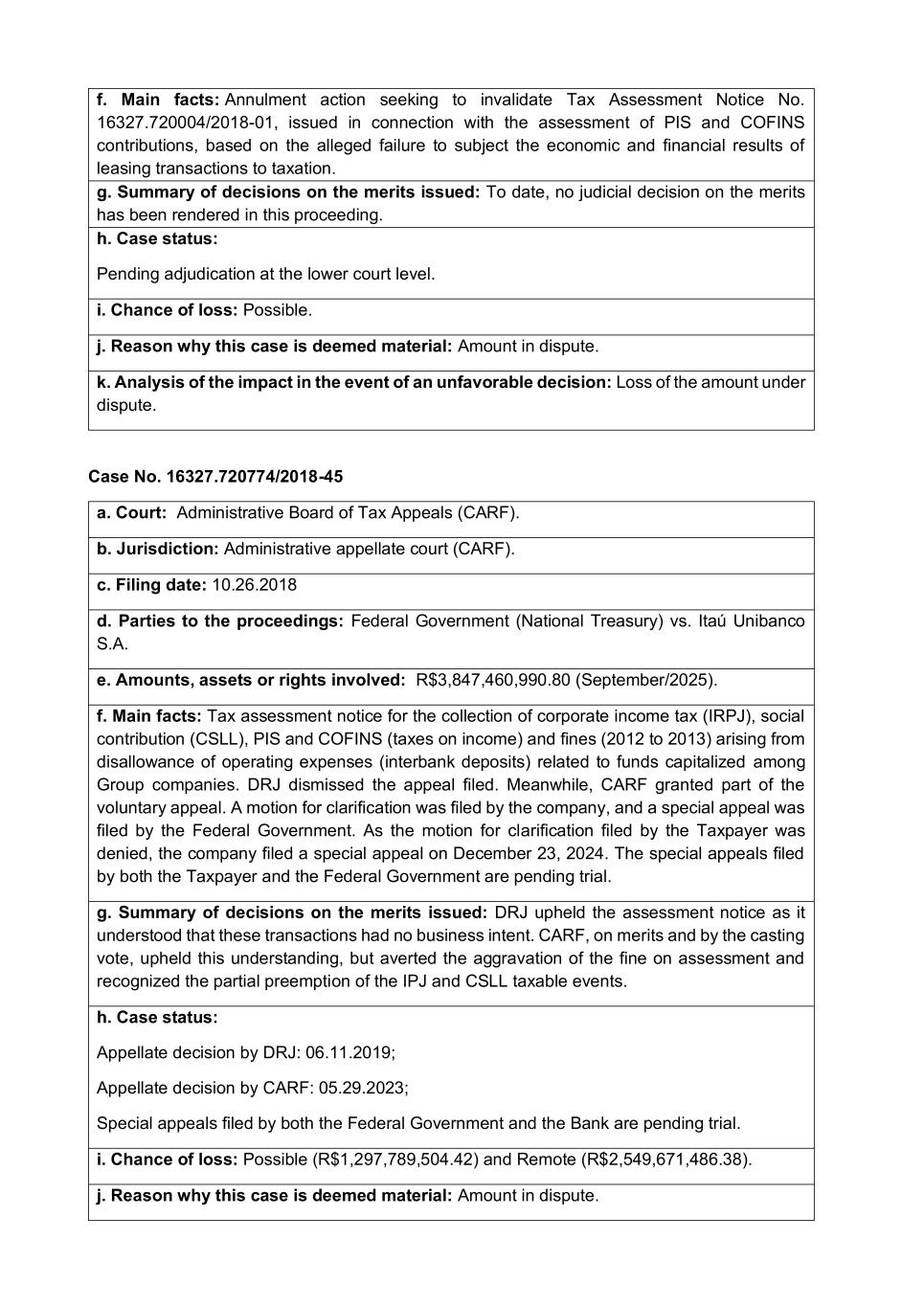 f. Main facts: Annulment action seeking to invalidate Tax Assessment Notice No. 16327.720004/2018-01, issued in connection with the assessment of PIS and COFINS contributions, based on the alleged failure to subject the economic and financial results of leasing transactions to taxation. g. Summary of decisions on the merits issued: To date, no judicial decision on the merits has been rendered in this proceeding. h. Case status: Pending adjudication at the lower court level. i. Chance of loss: Possible. j. Reason why this case is deemed material: Amount in dispute. k. Analysis of the impact in the event of an unfavorable decision: Loss of the amount under dispute. Case No. 16327.720774/2018-45 a. Court: Administrative Board of Tax Appeals (CARF). b. Jurisdiction: Administrative appellate court (CARF). c. Filing date: 10.26.2018 d. Parties to the proceedings: Federal Government (National Treasury) vs. Itaú Unibanco S.A. e. Amounts, assets or rights involved: R$3,847,460,990.80 (September/2025). f. Main facts: Tax assessment notice for the collection of corporate income tax (IRPJ), social contribution (CSLL), PIS and COFINS (taxes on income) and fines (2012 to 2013) arising from disallowance of operating expenses (interbank deposits) related to funds capitalized among Group companies. DRJ dismissed the appeal filed. Meanwhile, CARF granted part of the voluntary appeal. A motion for clarification was filed by the company, and a special appeal was filed by the Federal Government. As the motion for clarification filed by the Taxpayer was denied, the company filed a special appeal on December 23, 2024. The special appeals filed by both the Taxpayer and the Federal Government are pending trial. g. Summary of decisions on the merits issued: DRJ upheld the assessment notice as it understood that these transactions had no business intent. CARF, on merits and by the casting vote, upheld this understanding, but averted the aggravation of the fine on assessment and recognized the partial preemption of the IPJ and CSLL taxable events. h. Case status: Appellate decision by DRJ: 06.11.2019; Appellate decision by CARF: 05.29.2023; Special appeals filed by both the Federal Government and the Bank are pending trial. i. Chance of loss: Possible (R$1,297,789,504.42) and Remote (R$2,549,671,486.38). j. Reason why this case is deemed material: Amount in dispute.