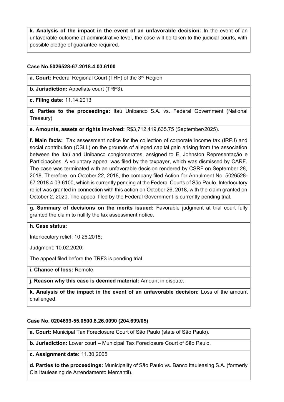 k. Analysis of the impact in the event of an unfavorable decision: In the event of an unfavorable outcome at administrative level, the case will be taken to the judicial courts, with possible pledge of guarantee required. Case No.5026528-67.2018.4.03.6100 a. Court: Federal Regional Court (TRF) of the 3rd Region b. Jurisdiction: Appellate court (TRF3). c. Filing date: 11.14.2013 d. Parties to the proceedings: Itaú Unibanco S.A. vs. Federal Government (National Treasury). e. Amounts, assets or rights involved: R$3,712,419,635.75 (September/2025). f. Main facts: Tax assessment notice for the collection of corporate income tax (IRPJ) and social contribution (CSLL) on the grounds of alleged capital gain arising from the association between the Itaú and Unibanco conglomerates, assigned to E. Johnston Representação e Participações. A voluntary appeal was filed by the taxpayer, which was dismissed by CARF. The case was terminated with an unfavorable decision rendered by CSRF on September 28, 2018. Therefore, on October 22, 2018, the company filed Action for Annulment No. 5026528- 67.2018.4.03.6100, which is currently pending at the Federal Courts of São Paulo. Interlocutory relief was granted in connection with this action on October 26, 2018, with the claim granted on October 2, 2020. The appeal filed by the Federal Government is currently pending trial. g. Summary of decisions on the merits issued: Favorable judgment at trial court fully granted the claim to nullify the tax assessment notice. h. Case status: Interlocutory relief: 10.26.2018; Judgment: 10.02.2020; The appeal filed before the TRF3 is pending trial. i. Chance of loss: Remote. j. Reason why this case is deemed material: Amount in dispute. k. Analysis of the impact in the event of an unfavorable decision: Loss of the amount challenged. Case No. 0204699-55.0500.8.26.0090 (204.699/05) a. Court: Municipal Tax Foreclosure Court of São Paulo (state of São Paulo). b. Jurisdiction: Lower court – Municipal Tax Foreclosure Court of São Paulo. c. Assignment date: 11.30.2005 d. Parties to the proceedings: Municipality of São Paulo vs. Banco Itauleasing S.A. (formerly Cia Itauleasing de Arrendamento Mercantil).