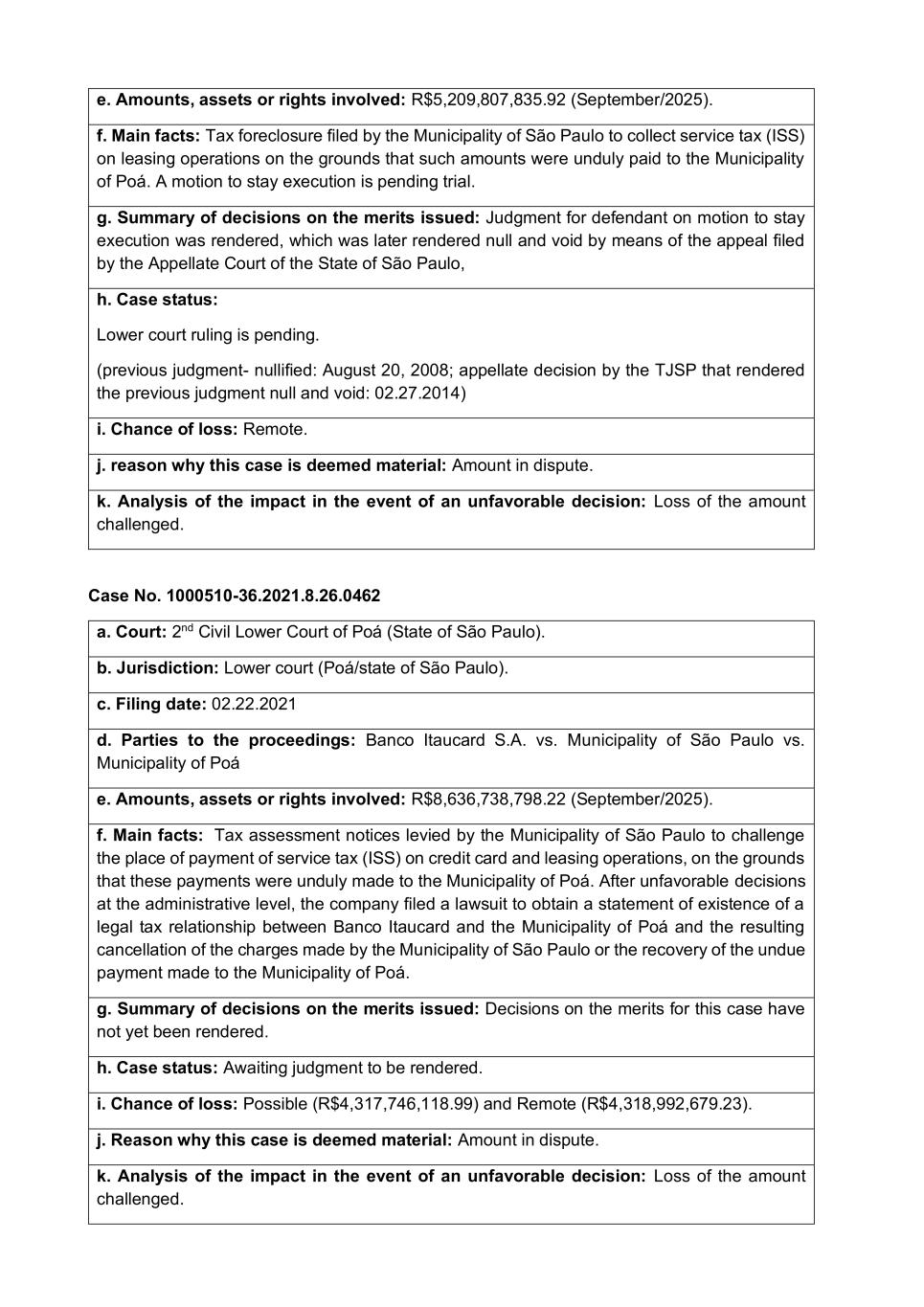 e. Amounts, assets or rights involved: R$5,209,807,835.92 (September/2025). f. Main facts: Tax foreclosure filed by the Municipality of São Paulo to collect service tax (ISS) on leasing operations on the grounds that such amounts were unduly paid to the Municipality of Poá. A motion to stay execution is pending trial. g. Summary of decisions on the merits issued: Judgment for defendant on motion to stay execution was rendered, which was later rendered null and void by means of the appeal filed by the Appellate Court of the State of São Paulo, h. Case status: Lower court ruling is pending. (previous judgment- nullified: August 20, 2008; appellate decision by the TJSP that rendered the previous judgment null and void: 02.27.2014) i. Chance of loss: Remote. j. reason why this case is deemed material: Amount in dispute. k. Analysis of the impact in the event of an unfavorable decision: Loss of the amount challenged. Case No. 1000510-36.2021.8.26.0462 a. Court: 2nd Civil Lower Court of Poá (State of São Paulo). b. Jurisdiction: Lower court (Poá/state of São Paulo). c. Filing date: 02.22.2021 d. Parties to the proceedings: Banco Itaucard S.A. vs. Municipality of São Paulo vs. Municipality of Poá e. Amounts, assets or rights involved: R$8,636,738,798.22 (September/2025). f. Main facts: Tax assessment notices levied by the Municipality of São Paulo to challenge the place of payment of service tax (ISS) on credit card and leasing operations, on the grounds that these payments were unduly made to the Municipality of Poá. After unfavorable decisions at the administrative level, the company filed a lawsuit to obtain a statement of existence of a legal tax relationship between Banco Itaucard and the Municipality of Poá and the resulting cancellation of the charges made by the Municipality of São Paulo or the recovery of the undue payment made to the Municipality of Poá. g. Summary of decisions on the merits issued: Decisions on the merits for this case have not yet been rendered. h. Case status: Awaiting judgment to be rendered. i. Chance of loss: Possible (R$4,317,746,118.99) and Remote (R$4,318,992,679.23). j. Reason why this case is deemed material: Amount in dispute. k. Analysis of the impact in the event of an unfavorable decision: Loss of the amount challenged.