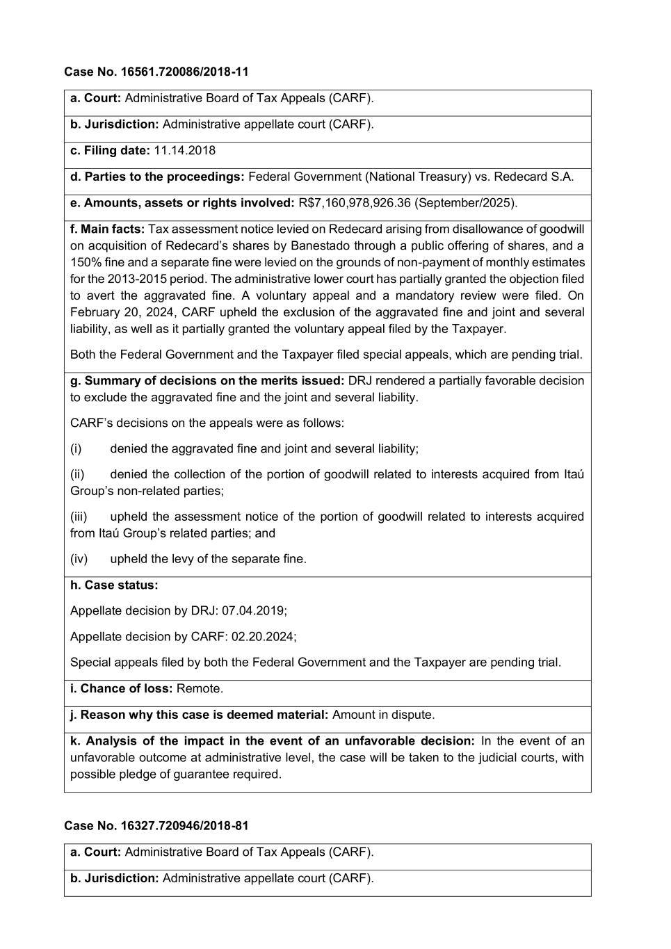 Case No. 16561.720086/2018-11 a. Court: Administrative Board of Tax Appeals (CARF). b. Jurisdiction: Administrative appellate court (CARF). c. Filing date: 11.14.2018 d. Parties to the proceedings: Federal Government (National Treasury) vs. Redecard S.A. e. Amounts, assets or rights involved: R$7,160,978,926.36 (September/2025). f. Main facts: Tax assessment notice levied on Redecard arising from disallowance of goodwill on acquisition of Redecard’s shares by Banestado through a public offering of shares, and a 150% fine and a separate fine were levied on the grounds of non-payment of monthly estimates for the 2013-2015 period. The administrative lower court has partially granted the objection filed to avert the aggravated fine. A voluntary appeal and a mandatory review were filed. On February 20, 2024, CARF upheld the exclusion of the aggravated fine and joint and several liability, as well as it partially granted the voluntary appeal filed by the Taxpayer. Both the Federal Government and the Taxpayer filed special appeals, which are pending trial. g. Summary of decisions on the merits issued: DRJ rendered a partially favorable decision to exclude the aggravated fine and the joint and several liability. CARF’s decisions on the appeals were as follows: (i) denied the aggravated fine and joint and several liability; (ii) denied the collection of the portion of goodwill related to interests acquired from Itaú Group’s non-related parties; (iii) upheld the assessment notice of the portion of goodwill related to interests acquired from Itaú Group’s related parties; and (iv) upheld the levy of the separate fine. h. Case status: Appellate decision by DRJ: 07.04.2019; Appellate decision by CARF: 02.20.2024; Special appeals filed by both the Federal Government and the Taxpayer are pending trial. i. Chance of loss: Remote. j. Reason why this case is deemed material: Amount in dispute. k. Analysis of the impact in the event of an unfavorable decision: In the event of an unfavorable outcome at administrative level, the case will be taken to the judicial courts, with possible pledge of guarantee required. Case No. 16327.720946/2018-81 a. Court: Administrative Board of Tax Appeals (CARF). b. Jurisdiction: Administrative appellate court (CARF).