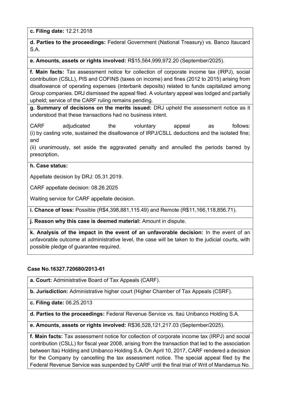 c. Filing date: 12.21.2018 d. Parties to the proceedings: Federal Government (National Treasury) vs. Banco Itaucard S.A. e. Amounts, assets or rights involved: R$15,564,999,972.20 (September/2025). f. Main facts: Tax assessment notice for collection of corporate income tax (IRPJ), social contribution (CSLL), PIS and COFINS (taxes on income) and fines (2012 to 2015) arising from disallowance of operating expenses (interbank deposits) related to funds capitalized among Group companies. DRJ dismissed the appeal filed. A voluntary appeal was lodged and partially upheld; service of the CARF ruling remains pending. g. Summary of decisions on the merits issued: DRJ upheld the assessment notice as it understood that these transactions had no business intent. CARF adjudicated the voluntary appeal as follows: (i) by casting vote, sustained the disallowance of IRPJ/CSLL deductions and the isolated fine; and (ii) unanimously, set aside the aggravated penalty and annulled the periods barred by prescription. h. Case status: Appellate decision by DRJ: 05.31.2019. CARF appellate decision: 08.26.2025 Waiting service for CARF appellate decision. i. Chance of loss: Possible (R$4,398,881,115.49) and Remote (R$11,166,118,856.71). j. Reason why this case is deemed material: Amount in dispute. k. Analysis of the impact in the event of an unfavorable decision: In the event of an unfavorable outcome at administrative level, the case will be taken to the judicial courts, with possible pledge of guarantee required. Case No.16327.720680/2013-61 a. Court: Administrative Board of Tax Appeals (CARF). b. Jurisdiction: Administrative higher court (Higher Chamber of Tax Appeals (CSRF). c. Filing date: 06.25.2013 d. Parties to the proceedings: Federal Revenue Service vs. Itaú Unibanco Holding S.A. e. Amounts, assets or rights involved: R$36,528,121,217.03 (September/2025). f. Main facts: Tax assessment notice for collection of corporate income tax (IRPJ) and social contribution (CSLL) for fiscal year 2008, arising from the transaction that led to the association between Itaú Holding and Unibanco Holding S.A. On April 10, 2017, CARF rendered a decision for the Company by cancelling the tax assessment notice. The special appeal filed by the Federal Revenue Service was suspended by CARF until the final trial of Writ of Mandamus No.