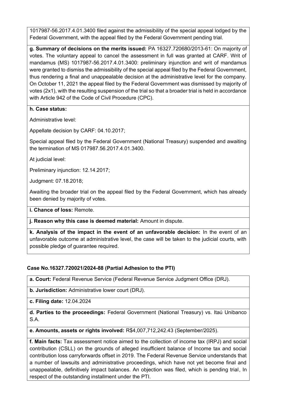 1017987-56.2017.4.01.3400 filed against the admissibility of the special appeal lodged by the Federal Government, with the appeal filed by the Federal Government pending trial. g. Summary of decisions on the merits issued: PA 16327.720680/2013-61: On majority of votes. The voluntary appeal to cancel the assessment in full was granted at CARF. Writ of mandamus (MS) 1017987-56.2017.4.01.3400: preliminary injunction and writ of mandamus were granted to dismiss the admissibility of the special appeal filed by the Federal Government, thus rendering a final and unappealable decision at the administrative level for the company. On October 11, 2021 the appeal filed by the Federal Government was dismissed by majority of votes (2x1), with the resulting suspension of the trial so that a broader trial is held in accordance with Article 942 of the Code of Civil Procedure (CPC). h. Case status: Administrative level: Appellate decision by CARF: 04.10.2017; Special appeal filed by the Federal Government (National Treasury) suspended and awaiting the termination of MS 017987.56.2017.4.01.3400. At judicial level: Preliminary injunction: 12.14.2017; Judgment: 07.18.2018; Awaiting the broader trial on the appeal filed by the Federal Government, which has already been denied by majority of votes. i. Chance of loss: Remote. j. Reason why this case is deemed material: Amount in dispute. k. Analysis of the impact in the event of an unfavorable decision: In the event of an unfavorable outcome at administrative level, the case will be taken to the judicial courts, with possible pledge of guarantee required. Case No.16327.720021/2024-88 (Partial Adhesion to the PTI) a. Court: Federal Revenue Service (Federal Revenue Service Judgment Office (DRJ). b. Jurisdiction: Administrative lower court (DRJ). c. Filing date: 12.04.2024 d. Parties to the proceedings: Federal Government (National Treasury) vs. Itaú Unibanco S.A. e. Amounts, assets or rights involved: R$4,007,712,242.43 (September/2025). f. Main facts: Tax assessment notice aimed to the collection of income tax (IRPJ) and social contribution (CSLL) on the grounds of alleged insufficient balance of Income tax and social contribution loss carryforwards offset in 2019. The Federal Revenue Service understands that a number of lawsuits and administrative proceedings, which have not yet become final and unappealable, definitively impact balances. An objection was filed, which is pending trial, In respect of the outstanding installment under the PTI.