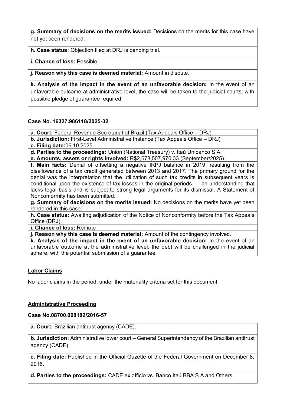 g. Summary of decisions on the merits issued: Decisions on the merits for this case have not yet been rendered. h. Case status: Objection filed at DRJ is pending trial. i. Chance of loss: Possible. j. Reason why this case is deemed material: Amount in dispute. k. Analysis of the impact in the event of an unfavorable decision: In the event of an unfavorable outcome at administrative level, the case will be taken to the judicial courts, with possible pledge of guarantee required. Case No. 16327.986118/2025-32 a. Court: Federal Revenue Secretariat of Brazil (Tax Appeals Office – DRJ) b. Jurisdiction: First-Level Administrative Instance (Tax Appeals Office – DRJ) c. Filing date:06.10.2025 d. Parties to the proceedings: Union (National Treasury) v. Itaú Unibanco S.A. e. Amounts, assets or rights involved: R$2,678,507,970.33 (September/2025). f. Main facts: Denial of offsetting a negative IRPJ balance in 2019, resulting from the disallowance of a tax credit generated between 2013 and 2017. The primary ground for the denial was the interpretation that the utilization of such tax credits in subsequent years is conditional upon the existence of tax losses in the original periods — an understanding that lacks legal basis and is subject to strong legal arguments for its dismissal. A Statement of Nonconformity has been submitted. g. Summary of decisions on the merits issued: No decisions on the merits have yet been rendered in this case. h. Case status: Awaiting adjudication of the Notice of Nonconformity before the Tax Appeals Office (DRJ). i. Chance of loss: Remote j. Reason why this case is deemed material: Amount of the contingency involved. k. Analysis of the impact in the event of an unfavorable decision: In the event of an unfavorable outcome at the administrative level, the debt will be challenged in the judicial sphere, with the potential submission of a guarantee. Labor Claims No labor claims in the period, under the materiality criteria set for this document. Administrative Proceeding Case No.08700.008182/2016-57 a. Court: Brazilian antitrust agency (CADE). b. Jurisdiction: Administrative lower court – General Superintendency of the Brazilian antitrust agency (CADE). c. Filing date: Published in the Official Gazette of the Federal Government on December 8, 2016. d. Parties to the proceedings: CADE ex officio vs. Banco Itaú BBA S.A and Others.