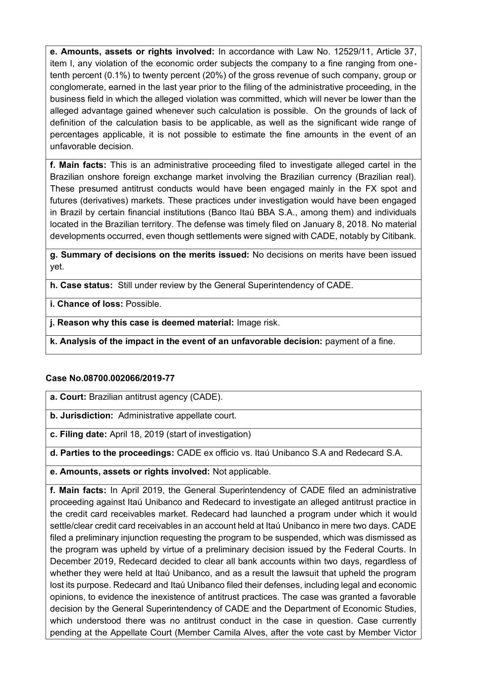 e. Amounts, assets or rights involved: In accordance with Law No. 12529/11, Article 37, item I, any violation of the economic order subjects the company to a fine ranging from one- tenth percent (0.1%) to twenty percent (20%) of the gross revenue of such company, group or conglomerate, earned in the last year prior to the filing of the administrative proceeding, in the business field in which the alleged violation was committed, which will never be lower than the alleged advantage gained whenever such calculation is possible. On the grounds of lack of definition of the calculation basis to be applicable, as well as the significant wide range of percentages applicable, it is not possible to estimate the fine amounts in the event of an unfavorable decision. f. Main facts: This is an administrative proceeding filed to investigate alleged cartel in the Brazilian onshore foreign exchange market involving the Brazilian currency (Brazilian real). These presumed antitrust conducts would have been engaged mainly in the FX spot and futures (derivatives) markets. These practices under investigation would have been engaged in Brazil by certain financial institutions (Banco Itaú BBA S.A., among them) and individuals located in the Brazilian territory. The defense was timely filed on January 8, 2018. No material developments occurred, even though settlements were signed with CADE, notably by Citibank. g. Summary of decisions on the merits issued: No decisions on merits have been issued yet. h. Case status: Still under review by the General Superintendency of CADE. i. Chance of loss: Possible. j. Reason why this case is deemed material: Image risk. k. Analysis of the impact in the event of an unfavorable decision: payment of a fine. Case No.08700.002066/2019-77 a. Court: Brazilian antitrust agency (CADE). b. Jurisdiction: Administrative appellate court. c. Filing date: April 18, 2019 (start of investigation) d. Parties to the proceedings: CADE ex officio vs. Itaú Unibanco S.A and Redecard S.A. e. Amounts, assets or rights involved: Not applicable. f. Main facts: In April 2019, the General Superintendency of CADE filed an administrative proceeding against Itaú Unibanco and Redecard to investigate an alleged antitrust practice in the credit card receivables market. Redecard had launched a program under which it would settle/clear credit card receivables in an account held at Itaú Unibanco in mere two days. CADE filed a preliminary injunction requesting the program to be suspended, which was dismissed as the program was upheld by virtue of a preliminary decision issued by the Federal Courts. In December 2019, Redecard decided to clear all bank accounts within two days, regardless of whether they were held at Itaú Unibanco, and as a result the lawsuit that upheld the program lost its purpose. Redecard and Itaú Unibanco filed their defenses, including legal and economic opinions, to evidence the inexistence of antitrust practices. The case was granted a favorable decision by the General Superintendency of CADE and the Department of Economic Studies, which understood there was no antitrust conduct in the case in question. Case currently pending at the Appellate Court (Member Camila Alves, after the vote cast by Member Victor