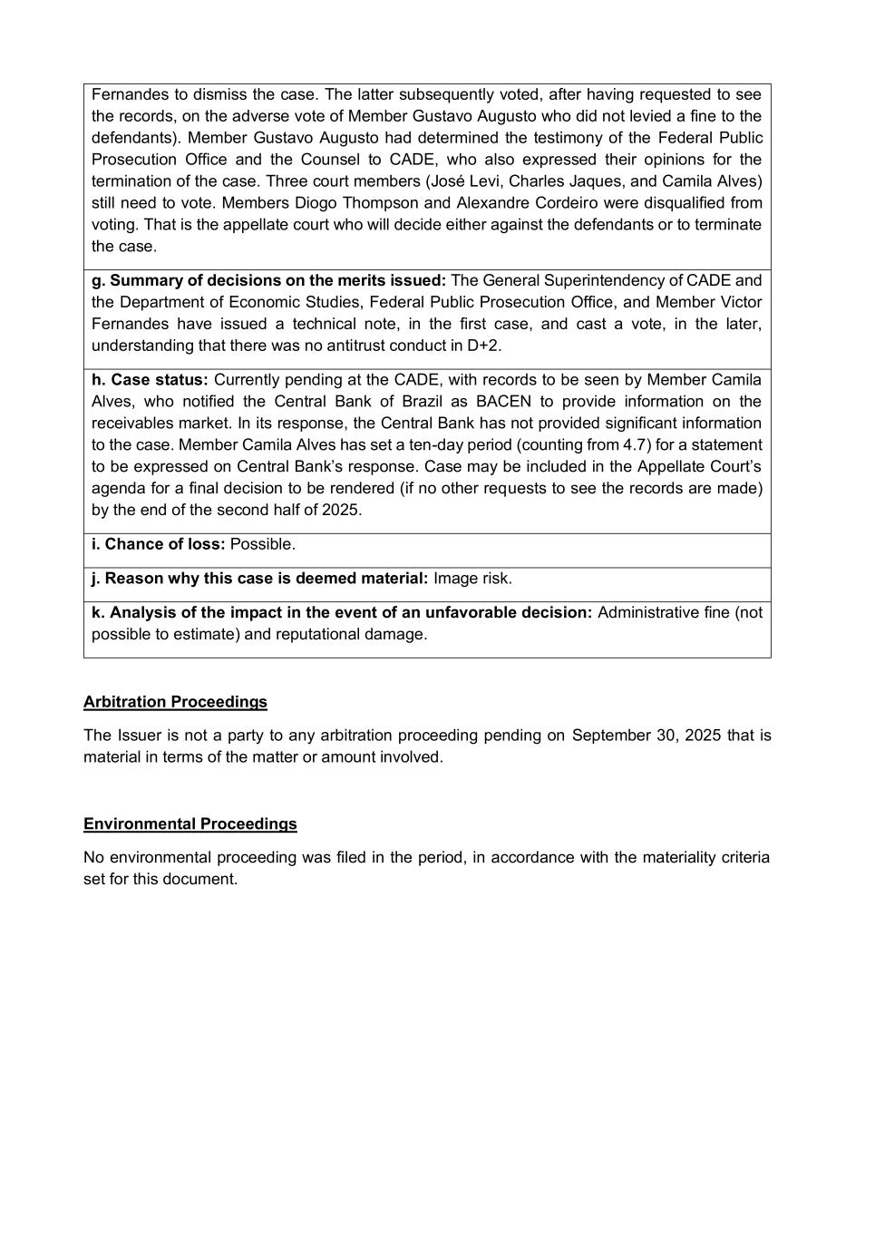 Fernandes to dismiss the case. The latter subsequently voted, after having requested to see the records, on the adverse vote of Member Gustavo Augusto who did not levied a fine to the defendants). Member Gustavo Augusto had determined the testimony of the Federal Public Prosecution Office and the Counsel to CADE, who also expressed their opinions for the termination of the case. Three court members (José Levi, Charles Jaques, and Camila Alves) still need to vote. Members Diogo Thompson and Alexandre Cordeiro were disqualified from voting. That is the appellate court who will decide either against the defendants or to terminate the case. g. Summary of decisions on the merits issued: The General Superintendency of CADE and the Department of Economic Studies, Federal Public Prosecution Office, and Member Victor Fernandes have issued a technical note, in the first case, and cast a vote, in the later, understanding that there was no antitrust conduct in D+2. h. Case status: Currently pending at the CADE, with records to be seen by Member Camila Alves, who notified the Central Bank of Brazil as BACEN to provide information on the receivables market. In its response, the Central Bank has not provided significant information to the case. Member Camila Alves has set a ten-day period (counting from 4.7) for a statement to be expressed on Central Bank’s response. Case may be included in the Appellate Court’s agenda for a final decision to be rendered (if no other requests to see the records are made) by the end of the second half of 2025. i. Chance of loss: Possible. j. Reason why this case is deemed material: Image risk. k. Analysis of the impact in the event of an unfavorable decision: Administrative fine (not possible to estimate) and reputational damage. Arbitration Proceedings The Issuer is not a party to any arbitration proceeding pending on September 30, 2025 that is material in terms of the matter or amount involved. Environmental Proceedings No environmental proceeding was filed in the period, in accordance with the materiality criteria set for this document.