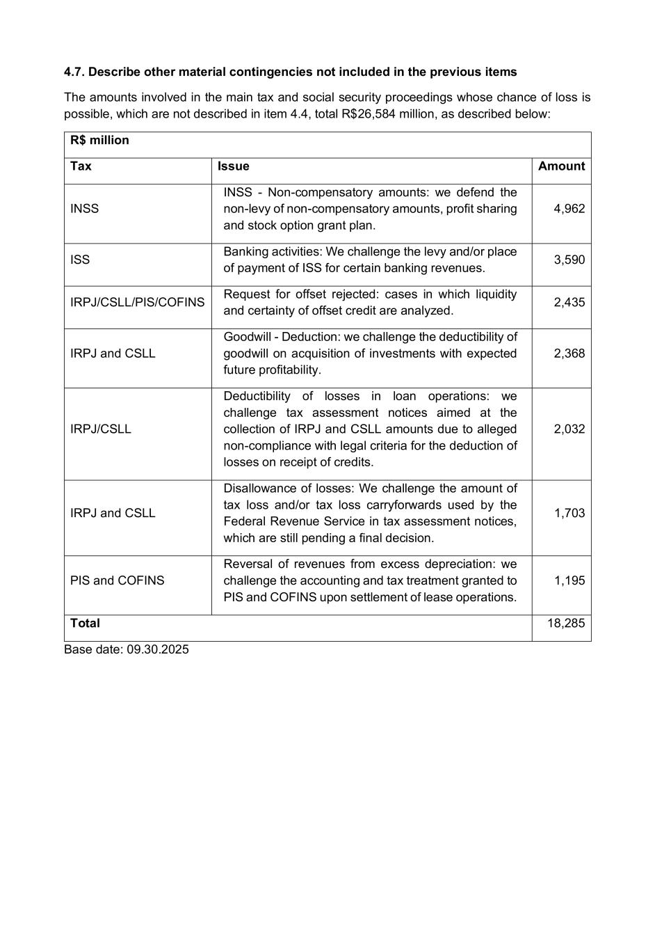 4.7. Describe other material contingencies not included in the previous items The amounts involved in the main tax and social security proceedings whose chance of loss is possible, which are not described in item 4.4, total R$26,584 million, as described below: R$ million Tax Issue Amount INSS INSS - Non-compensatory amounts: we defend the non-levy of non-compensatory amounts, profit sharing and stock option grant plan. 4,962 ISS Banking activities: We challenge the levy and/or place of payment of ISS for certain banking revenues. 3,590 IRPJ/CSLL/PIS/COFINS Request for offset rejected: cases in which liquidity and certainty of offset credit are analyzed. 2,435 IRPJ and CSLL Goodwill - Deduction: we challenge the deductibility of goodwill on acquisition of investments with expected future profitability. 2,368 IRPJ/CSLL Deductibility of losses in loan operations: we challenge tax assessment notices aimed at the collection of IRPJ and CSLL amounts due to alleged non-compliance with legal criteria for the deduction of losses on receipt of credits. 2,032 IRPJ and CSLL Disallowance of losses: We challenge the amount of tax loss and/or tax loss carryforwards used by the Federal Revenue Service in tax assessment notices, which are still pending a final decision. 1,703 PIS and COFINS Reversal of revenues from excess depreciation: we challenge the accounting and tax treatment granted to PIS and COFINS upon settlement of lease operations. 1,195 Total 18,285 Base date: 09.30.2025