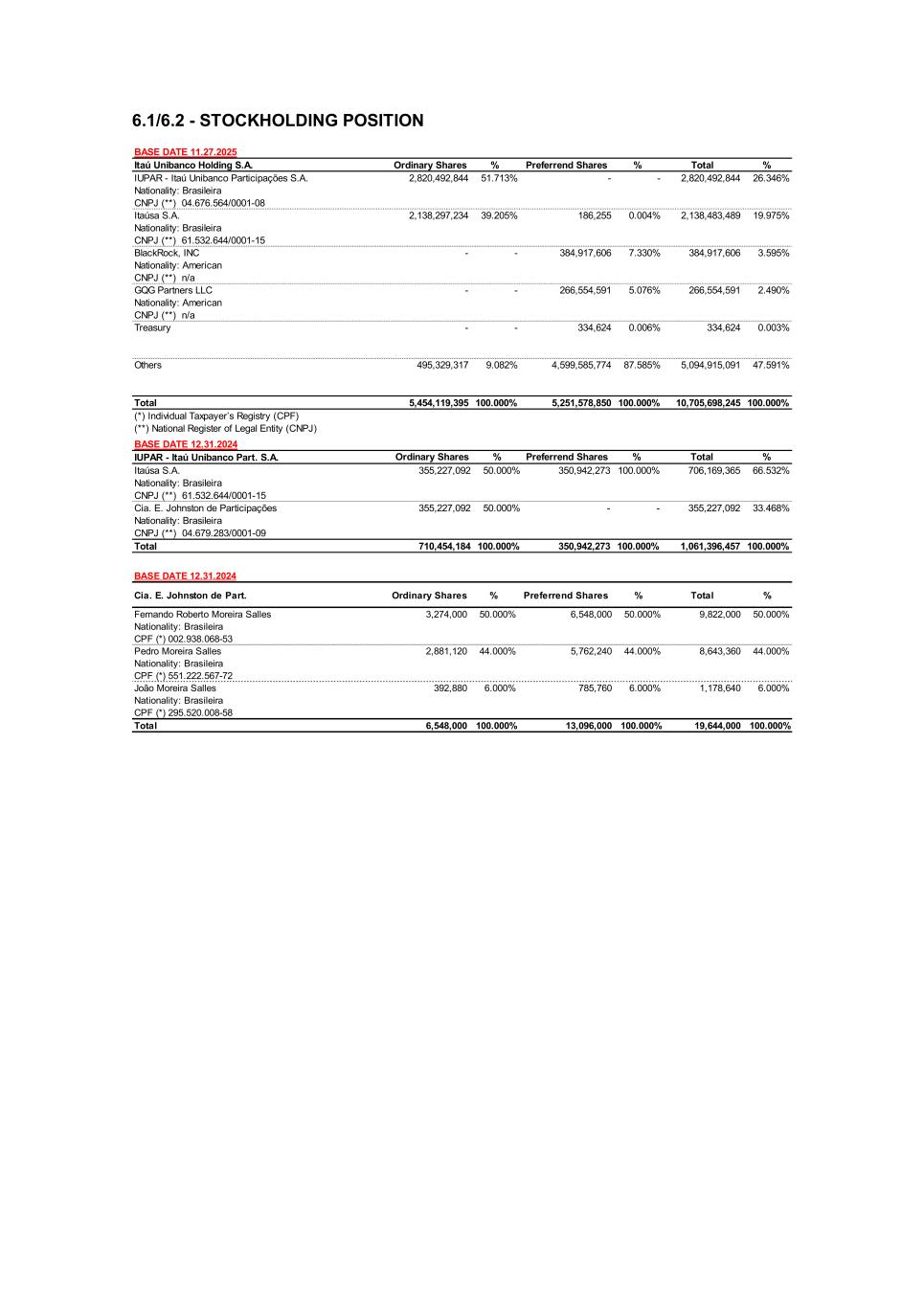 6.1/6.2 - STOCKHOLDING POSITION BASE DATE 11.27.2025 Itaú Unibanco Holding S.A. Ordinary Shares % Preferrend Shares % Total % IUPAR - Itaú Unibanco Participações S.A. 2,820,492,844 51.713% - - 2,820,492,844 26.346% Nationality: Brasileira CNPJ (**) 04.676.564/0001-08 Itaúsa S.A. 2,138,297,234 39.205% 186,255 0.004% 2,138,483,489 19.975% Nationality: Brasileira CNPJ (**) 61.532.644/0001-15 BlackRock, INC - - 384,917,606 7.330% 384,917,606 3.595% Nationality: American CNPJ (**) n/a GQG Partners LLC - - 266,554,591 5.076% 266,554,591 2.490% Nationality: American CNPJ (**) n/a Treasury - - 334,624 0.006% 334,624 0.003% Others 495,329,317 9.082% 4,599,585,774 87.585% 5,094,915,091 47.591% Total 5,454,119,395 100.000% 5,251,578,850 100.000% 10,705,698,245 100.000% (*) Individual Taxpayer’s Registry (CPF) (**) National Register of Legal Entity (CNPJ) BASE DATE 12.31.2024 IUPAR - Itaú Unibanco Part. S.A. Ordinary Shares % Preferrend Shares % Total % Itaúsa S.A. 355,227,092 50.000% 350,942,273 100.000% 706,169,365 66.532% Nationality: Brasileira CNPJ (**) 61.532.644/0001-15 Cia. E. Johnston de Participações 355,227,092 50.000% - - 355,227,092 33.468% Nationality: Brasileira CNPJ (**) 04.679.283/0001-09 Total 710,454,184 100.000% 350,942,273 100.000% 1,061,396,457 100.000% BASE DATE 12.31.2024 Cia. E. Johnston de Part. Ordinary Shares % Preferrend Shares % Total % Fernando Roberto Moreira Salles 3,274,000 50.000% 6,548,000 50.000% 9,822,000 50.000% Nationality: Brasileira CPF (*) 002.938.068-53 Pedro Moreira Salles 2,881,120 44.000% 5,762,240 44.000% 8,643,360 44.000% Nationality: Brasileira CPF (*) 551.222.567-72 João Moreira Salles 392,880 6.000% 785,760 6.000% 1,178,640 6.000% Nationality: Brasileira CPF (*) 295.520.008-58 Total 6,548,000 100.000% 13,096,000 100.000% 19,644,000 100.000%