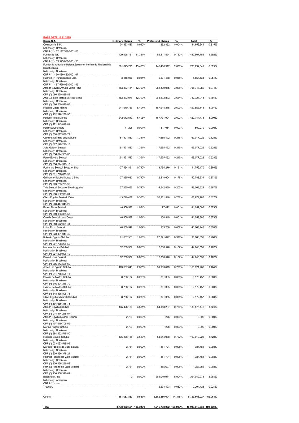 BASE DATE 10.31.2025 Itaúsa S.A. Ordinary Shares % Preferrend Shares % Total % Companhia ESA 34,363,487 0.910% 292,862 0.004% 34,656,349 0.315% Nationality: Brasileira CNPJ (**) 52.117.397/0001-08 Fundação Itaú 429,996,161 11.381% 52,811,594 0.732% 482,807,755 4.392% Nationality: Brasileira CNPJ (**) 59.573.030/0001-30 Fundação Antonio e Helena Zerrenner Instituição Nacional de Beneficência 581,825,725 15.400% 146,466,917 2.030% 728,292,642 6.625% Nationality: Brasileira CNPJ (**) 60.480.480/0001-67 Rudric ITH Participações Ltda. 3,156,066 0.084% 2,501,468 0.035% 5,657,534 0.051% Nationality: Brasileira CNPJ (**) 67.569.061/0001-45 Alfredo Egydio Arruda Villela Filho 483,333,114 12.793% 283,409,975 3.928% 766,743,089 6.974% Nationality: Brasileira CPF (*) 066.530.838-88 Ana Lúcia de Mattos Barreto Villela 483,333,078 12.793% 264,393,833 3.664% 747,726,911 6.801% Nationality: Brasileira CPF (*) 066.530.828-06 Ricardo Villela Marino 241,940,736 6.404% 187,614,375 2.600% 429,555,111 3.907% Nationality: Brasileira CPF (*) 252.398.288-90 Rodolfo Villela Marino 242,012,549 6.406% 187,731,924 2.602% 429,744,473 3.909% Nationality: Brasileira CPF (*) 271.943.018-81 Paulo Setubal Neto 41,295 0.001% 517,984 0.007% 559,279 0.005% Nationality: Brasileira CPF (*) 638.097.888-72 Carolina Marinho Lutz Setubal 51,421,530 1.361% 17,655,492 0.245% 69,077,022 0.628% Nationality: Brasileira CPF (*) 077.540.228-18 Julia Guidon Setubal 51,421,530 1.361% 17,655,492 0.245% 69,077,022 0.628% Nationality: Brasileira CPF (*) 336.694.358-08 Paulo Egydio Setubal 51,421,530 1.361% 17,655,492 0.245% 69,077,022 0.628% Nationality: Brasileira CPF (*) 336.694.318-10 Fernando Setubal Souza e Silva 27,964,891 0.740% 13,794,279 0.191% 41,759,170 0.380% Nationality: Brasileira CPF (*) 311.798.878-59 Guilherme Setubal Souza e Silva 27,965,030 0.740% 12,818,604 0.178% 40,783,634 0.371% Nationality: Brasileira CPF (*) 269.253.728-92 Tide Setubal Souza e Silva Nogueira 27,965,465 0.740% 14,542,859 0.202% 42,508,324 0.387% Nationality: Brasileira CPF (*) 296.682.978-81 Olavo Egydio Setubal Júnior 13,710,477 0.363% 55,261,510 0.766% 68,971,987 0.627% Nationality: Brasileira CPF (*) 006.447.048-29 Bruno Rizzo Setubal 40,959,536 1.084% 97,472 0.001% 41,057,008 0.373% Nationality: Brasileira CPF (*) 299.133.368-56 Camila Setubal Lenz Cesar 40,959,537 1.084% 100,349 0.001% 41,059,886 0.373% Nationality: Brasileira CPF (*) 350.572.098-41 Luiza Rizzo Setubal 40,959,542 1.084% 109,200 0.002% 41,068,742 0.374% Nationality: Brasileira CPF (*) 323.461.948-40 Roberto Egydio Setubal 71,637,561 1.896% 27,271,077 0.378% 98,908,638 0.900% Nationality: Brasileira CPF (*) 007.738.228-52 Mariana Lucas Setubal 32,209,962 0.853% 12,030,570 0.167% 44,240,532 0.402% Nationality: Brasileira CPF (*) 227.809.998-10 Paula Lucas Setubal 32,209,962 0.853% 12,030,570 0.167% 44,240,532 0.402% Nationality: Brasileira CPF (*) 295.243.528-69 José Luiz Egydio Setubal 109,007,641 2.885% 51,963,619 0.720% 160,971,260 1.464% Nationality: Brasileira CPF (*) 011.785.508-18 Beatriz de Mattos Setubal 8,788,102 0.233% 391,355 0.005% 9,179,457 0.083% Nationality: Brasileira CPF (*) 316.394.318-70 Gabriel de Mattos Setubal 8,788,102 0.233% 391,355 0.005% 9,179,457 0.083% Nationality: Brasileira CPF (*) 348.338.808-73 Olavo Egydio Mutarelli Setubal 8,788,102 0.233% 391,355 0.005% 9,179,457 0.083% Nationality: Brasileira CPF (*) 394.635.348-73 Alfredo Egydio Setubal 135,428,159 3.585% 54,148,287 0.750% 189,576,446 1.724% Nationality: Brasileira CPF (*) 014.414.218-07 Alfredo Egydio Nugent Setubal 2,720 0.000% 276 0.000% 2,996 0.000% Nationality: Brasileira CPF (*) 407.919.708-09 Marina Nugent Setubal 2,720 0.000% 276 0.000% 2,996 0.000% Nationality: Brasileira CPF (*) 384.422.518-80 Ricardo Egydio Setubal 135,366,135 3.583% 54,644,088 0.757% 190,010,223 1.728% Nationality: Brasileira CPF (*) 033.033.518-99 Marcelo Ribeiro do Valle Setubal 2,761 0.000% 381,724 0.005% 384,485 0.003% Nationality: Brasileira CPF (*) 230.936.378-21 Rodrigo Ribeiro do Valle Setubal 2,761 0.000% 381,724 0.005% 384,485 0.003% Nationality: Brasileira CPF (*) 230.936.298-02 Patricia Ribeiro do Valle Setubal 2,761 0.000% 355,627 0.005% 358,388 0.003% Nationality: Brasileira CPF (*) 230.936.328-62 BlackRock, Inc 0 0.000% 361,049,971 5.004% 361,049,971 3.284% Nationality: American CNPJ (**) n/a Treasury - - 2,294,423 0.032% 2,294,423 0.021% Others 361,083,833 9.557% 5,362,580,094 74.318% 5,723,663,927 52.063% Total 3,778,072,561 100.000% 7,215,738,072 100.000% 10,993,810,633 100.000%