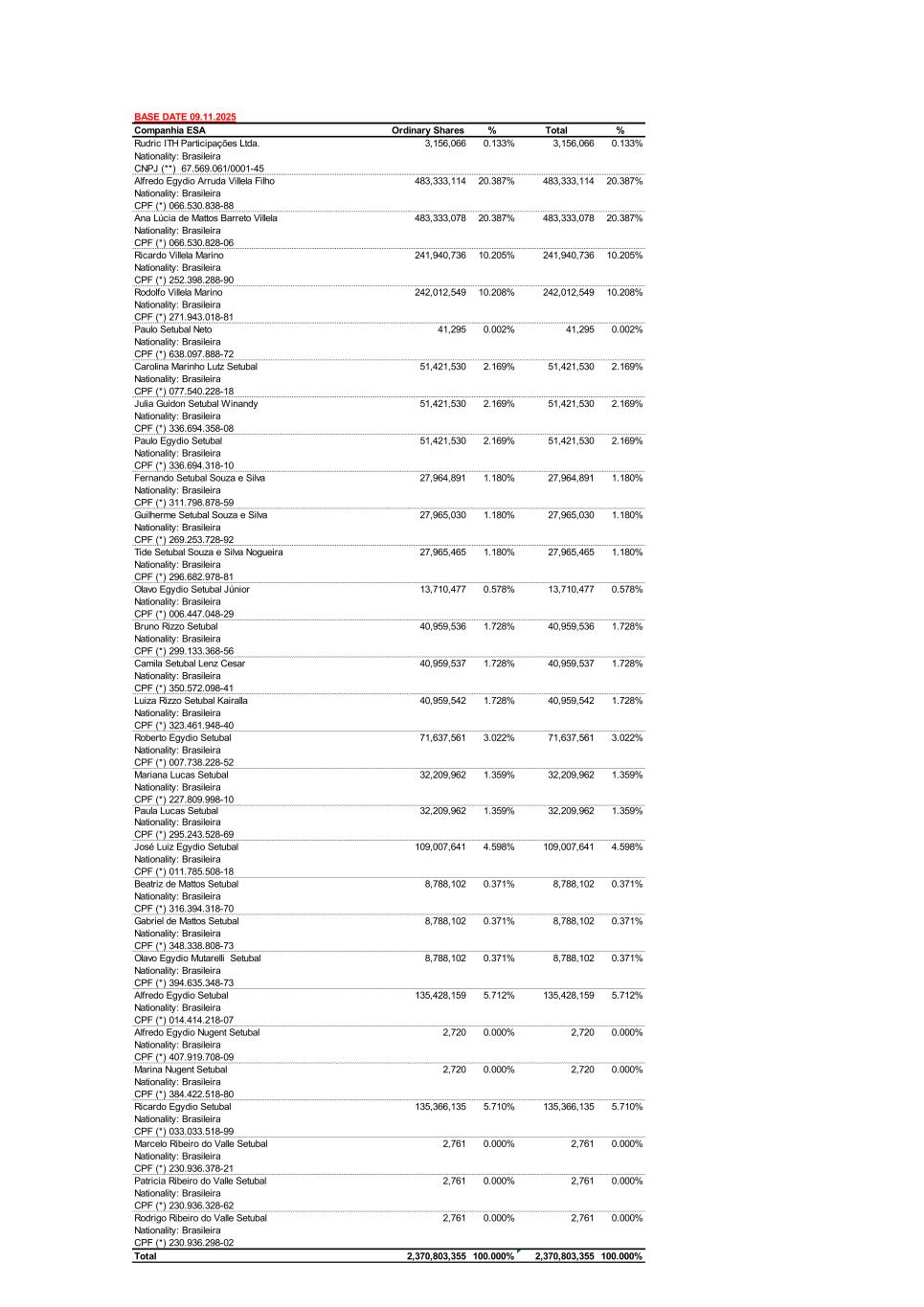 BASE DATE 09.11.2025 Companhia ESA Ordinary Shares % Total % Rudric ITH Participações Ltda. 3,156,066 0.133% 3,156,066 0.133% Nationality: Brasileira CNPJ (**) 67.569.061/0001-45 Alfredo Egydio Arruda Villela Filho 483,333,114 20.387% 483,333,114 20.387% Nationality: Brasileira CPF (*) 066.530.838-88 Ana Lúcia de Mattos Barreto Villela 483,333,078 20.387% 483,333,078 20.387% Nationality: Brasileira CPF (*) 066.530.828-06 Ricardo Villela Marino 241,940,736 10.205% 241,940,736 10.205% Nationality: Brasileira CPF (*) 252.398.288-90 Rodolfo Villela Marino 242,012,549 10.208% 242,012,549 10.208% Nationality: Brasileira CPF (*) 271.943.018-81 Paulo Setubal Neto 41,295 0.002% 41,295 0.002% Nationality: Brasileira CPF (*) 638.097.888-72 Carolina Marinho Lutz Setubal 51,421,530 2.169% 51,421,530 2.169% Nationality: Brasileira CPF (*) 077.540.228-18 Julia Guidon Setubal Winandy 51,421,530 2.169% 51,421,530 2.169% Nationality: Brasileira CPF (*) 336.694.358-08 Paulo Egydio Setubal 51,421,530 2.169% 51,421,530 2.169% Nationality: Brasileira CPF (*) 336.694.318-10 Fernando Setubal Souza e Silva 27,964,891 1.180% 27,964,891 1.180% Nationality: Brasileira CPF (*) 311.798.878-59 Guilherme Setubal Souza e Silva 27,965,030 1.180% 27,965,030 1.180% Nationality: Brasileira CPF (*) 269.253.728-92 Tide Setubal Souza e Silva Nogueira 27,965,465 1.180% 27,965,465 1.180% Nationality: Brasileira CPF (*) 296.682.978-81 Olavo Egydio Setubal Júnior 13,710,477 0.578% 13,710,477 0.578% Nationality: Brasileira CPF (*) 006.447.048-29 Bruno Rizzo Setubal 40,959,536 1.728% 40,959,536 1.728% Nationality: Brasileira CPF (*) 299.133.368-56 Camila Setubal Lenz Cesar 40,959,537 1.728% 40,959,537 1.728% Nationality: Brasileira CPF (*) 350.572.098-41 Luiza Rizzo Setubal Kairalla 40,959,542 1.728% 40,959,542 1.728% Nationality: Brasileira CPF (*) 323.461.948-40 Roberto Egydio Setubal 71,637,561 3.022% 71,637,561 3.022% Nationality: Brasileira CPF (*) 007.738.228-52 Mariana Lucas Setubal 32,209,962 1.359% 32,209,962 1.359% Nationality: Brasileira CPF (*) 227.809.998-10 Paula Lucas Setubal 32,209,962 1.359% 32,209,962 1.359% Nationality: Brasileira CPF (*) 295.243.528-69 José Luiz Egydio Setubal 109,007,641 4.598% 109,007,641 4.598% Nationality: Brasileira CPF (*) 011.785.508-18 Beatriz de Mattos Setubal 8,788,102 0.371% 8,788,102 0.371% Nationality: Brasileira CPF (*) 316.394.318-70 Gabriel de Mattos Setubal 8,788,102 0.371% 8,788,102 0.371% Nationality: Brasileira CPF (*) 348.338.808-73 Olavo Egydio Mutarelli Setubal 8,788,102 0.371% 8,788,102 0.371% Nationality: Brasileira CPF (*) 394.635.348-73 Alfredo Egydio Setubal 135,428,159 5.712% 135,428,159 5.712% Nationality: Brasileira CPF (*) 014.414.218-07 Alfredo Egydio Nugent Setubal 2,720 0.000% 2,720 0.000% Nationality: Brasileira CPF (*) 407.919.708-09 Marina Nugent Setubal 2,720 0.000% 2,720 0.000% Nationality: Brasileira CPF (*) 384.422.518-80 Ricardo Egydio Setubal 135,366,135 5.710% 135,366,135 5.710% Nationality: Brasileira CPF (*) 033.033.518-99 Marcelo Ribeiro do Valle Setubal 2,761 0.000% 2,761 0.000% Nationality: Brasileira CPF (*) 230.936.378-21 Patricia Ribeiro do Valle Setubal 2,761 0.000% 2,761 0.000% Nationality: Brasileira CPF (*) 230.936.328-62 Rodrigo Ribeiro do Valle Setubal 2,761 0.000% 2,761 0.000% Nationality: Brasileira CPF (*) 230.936.298-02 Total 2,370,803,355 100.000% 2,370,803,355 100.000%