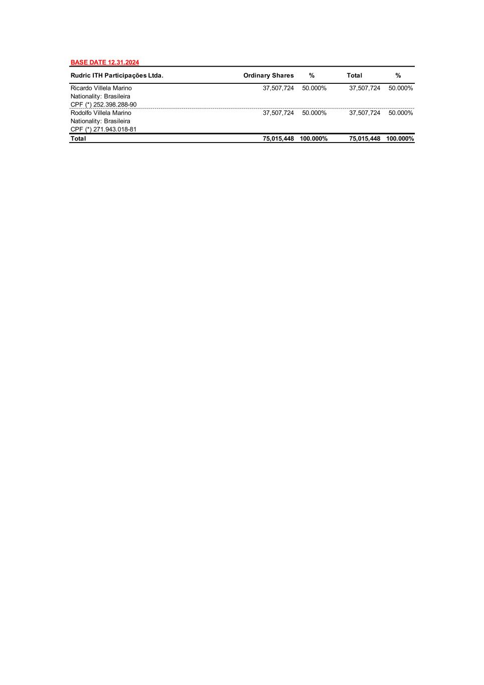 BASE DATE 12.31.2024 Rudric ITH Participações Ltda. Ordinary Shares % Total % Ricardo Villela Marino 37,507,724 50.000% 37,507,724 50.000% Nationality: Brasileira CPF (*) 252.398.288-90 Rodolfo Villela Marino 37,507,724 50.000% 37,507,724 50.000% Nationality: Brasileira CPF (*) 271.943.018-81 Total 75,015,448 100.000% 75,015,448 100.000%