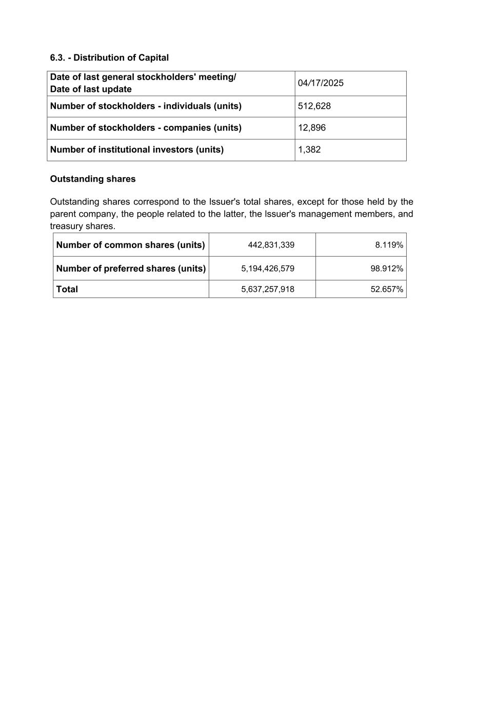 6.3. - Distribution of Capital Date of last general stockholders' meeting/ Date of last update 04/17/2025 Number of stockholders - individuals (units) 512,628 Number of stockholders - companies (units) 12,896 Number of institutional investors (units) 1,382 Outstanding shares Outstanding shares correspond to the lssuer's total shares, except for those held by the parent company, the people related to the latter, the lssuer's management members, and treasury shares. Number of common shares (units) 442,831,339 8.119% Number of preferred shares (units) 5,194,426,579 98.912% Total 5,637,257,918 52.657%