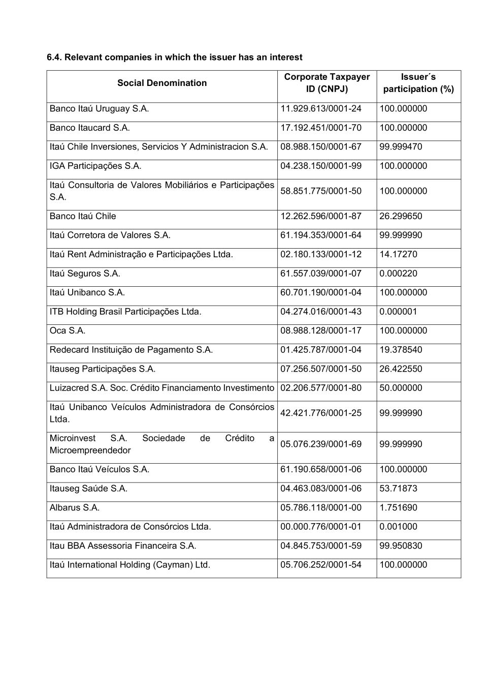 6.4. Relevant companies in which the issuer has an interest Social Denomination Corporate Taxpayer ID (CNPJ) Issuer´s participation (%) Banco Itaú Uruguay S.A. 11.929.613/0001-24 100.000000 Banco Itaucard S.A. 17.192.451/0001-70 100.000000 Itaú Chile Inversiones, Servicios Y Administracion S.A. 08.988.150/0001-67 99.999470 IGA Participações S.A. 04.238.150/0001-99 100.000000 Itaú Consultoria de Valores Mobiliários e Participações S.A. 58.851.775/0001-50 100.000000 Banco Itaú Chile 12.262.596/0001-87 26.299650 Itaú Corretora de Valores S.A. 61.194.353/0001-64 99.999990 Itaú Rent Administração e Participações Ltda. 02.180.133/0001-12 14.17270 Itaú Seguros S.A. 61.557.039/0001-07 0.000220 Itaú Unibanco S.A. 60.701.190/0001-04 100.000000 ITB Holding Brasil Participações Ltda. 04.274.016/0001-43 0.000001 Oca S.A. 08.988.128/0001-17 100.000000 Redecard Instituição de Pagamento S.A. 01.425.787/0001-04 19.378540 Itauseg Participações S.A. 07.256.507/0001-50 26.422550 Luizacred S.A. Soc. Crédito Financiamento Investimento 02.206.577/0001-80 50.000000 Itaú Unibanco Veículos Administradora de Consórcios Ltda. 42.421.776/0001-25 99.999990 Microinvest S.A. Sociedade de Crédito a Microempreendedor 05.076.239/0001-69 99.999990 Banco Itaú Veículos S.A. 61.190.658/0001-06 100.000000 Itauseg Saúde S.A. 04.463.083/0001-06 53.71873 Albarus S.A. 05.786.118/0001-00 1.751690 Itaú Administradora de Consórcios Ltda. 00.000.776/0001-01 0.001000 Itau BBA Assessoria Financeira S.A. 04.845.753/0001-59 99.950830 Itaú International Holding (Cayman) Ltd. 05.706.252/0001-54 100.000000