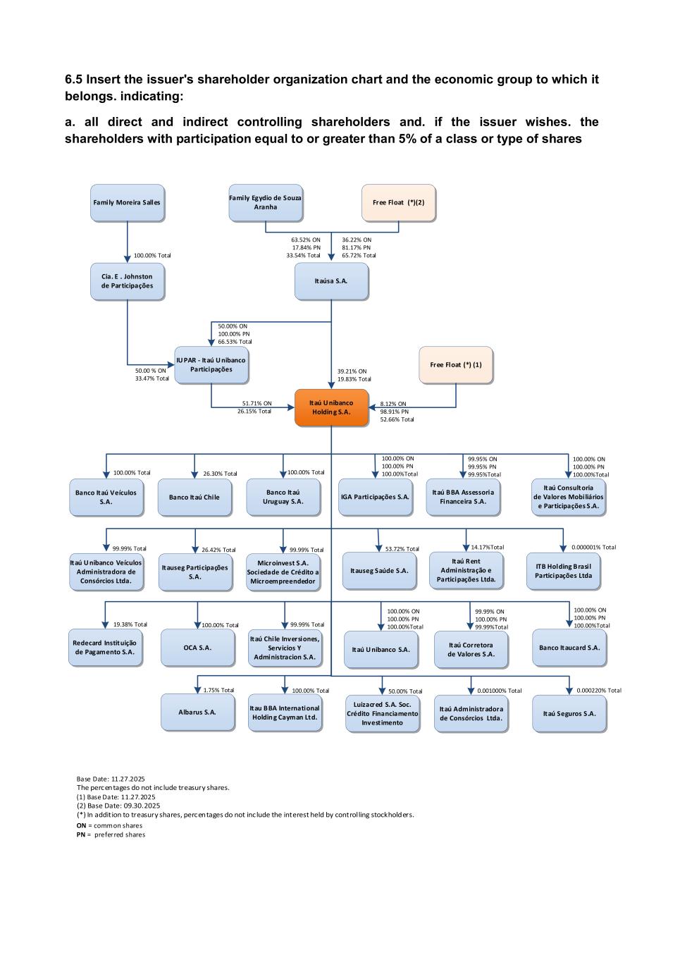 6.5 Insert the issuer's shareholder organization chart and the economic group to which it belongs. indicating: a. all direct and indirect controlling shareholders and. if the issuer wishes. the shareholders with participation equal to or greater than 5% of a class or type of shares Itaú U nibanco Holdin g S.A. IU PAR - Itaú U nibanco Participações Itaúsa S.A. 39.21% ON 19.83% Total 51.71% ON 26.15% Total 50.00% ON 100.00% PN 66.53% Total Free Float (*) (1) Cia. E . Johnston de Participações 8.12% ON 98.91% PN 52.66% Total 50.00 % ON 33.47% Total Family Egydio de Souza Aranha Free Float (*)(2)Family Moreira Salles 100.00% Total 63.52% ON 17.84% PN 33.54% Total 36.22% ON 81.17% PN 65.72% Total Banco Itaucard S.A.Itaú U nibanco S.A. Itaú Consultoria de Valores Mobiliários e Participações S.A. OCA S.A. Itaú Corretora de Valores S.A. Itaú BBA Assessoria Financeira S.A. Banco Itaú Uruguay S.A. 100.00% Total 100.00% Total 100.00% ON 100.00% PN 100.00%Total 99.99% ON 100.00% PN 99.99%Total 100.00% ON 100.00% PN 100.00%Total 99.95% ON 99.95% PN 99.95%Total 100.00% ON 100.00% PN 100.00%Total Itaú Chile Inversiones, Servicios Y Administracion S.A. 99.99% Total Banco Itaú Chile 26.30% Total IGA Participações S.A. 100.00% ON 100.00% PN 100.00%Total Itauseg Saúde S.A. Itaú Rent Administração e Participações Ltda. 14.17%Total ITB Holding Brasil Participações Ltda Banco Itaú Veículos S.A. Itaú U nibanco Veículos Administradora de Consórcios Ltda. Itauseg Participações S.A. Microinvest S.A. Sociedade de Crédito a Microempreendedor 100.00% Total 99.99% Total 26.42% Total 99.99% Total Redecard Instituição de Pagamento S.A. 19.38% Total Luizacred S.A. Soc. Crédito Financiamento Invest imento 50.00% Total 53.72% Total 0.000001% Total ON = common shares PN = preferred shares Base Date: 11.27.2025 (1) Base Date: 11.27.2025 Itaú Administradora de Consórcios Ltda. Itaú Seguros S.A. 0.001000% Total 0.000220% Total Albarus S.A. Itau BBA International Holdin g Cayman Ltd. 1.75% Total 100.00% Total
