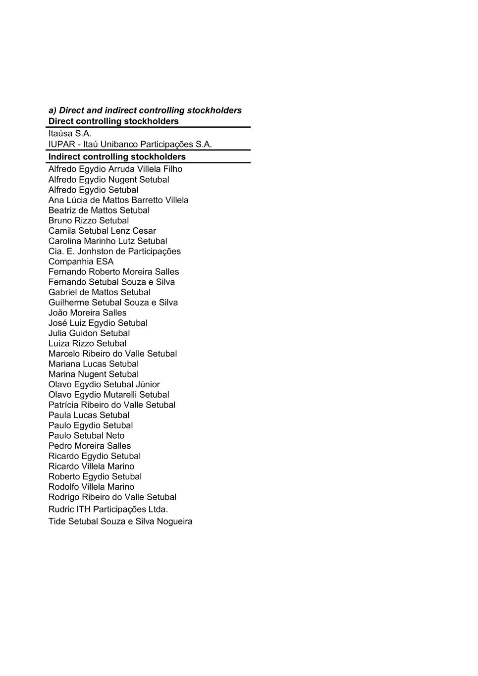 a) Direct and indirect controlling stockholders Direct controlling stockholders Itaúsa S.A. IUPAR - Itaú Unibanco Participações S.A. lndirect controlling stockholders Alfredo Egydio Arruda Villela Filho Alfredo Egydio Nugent Setubal Alfredo Egydio Setubal Ana Lúcia de Mattos Barretto Villela Beatriz de Mattos Setubal Bruno Rizzo Setubal Camila Setubal Lenz Cesar Carolina Marinho Lutz Setubal Cia. E. Jonhston de Participações Companhia ESA Fernando Roberto Moreira Salles Fernando Setubal Souza e Silva Gabriel de Mattos Setubal Guilherme Setubal Souza e Silva João Moreira Salles José Luiz Egydio Setubal Julia Guidon Setubal Luiza Rizzo Setubal Marcelo Ribeiro do Valle Setubal Mariana Lucas Setubal Marina Nugent Setubal Olavo Egydio Setubal Júnior Olavo Egydio Mutarelli Setubal Patrícia Ribeiro do Valle Setubal Paula Lucas Setubal Paulo Egydio Setubal Paulo Setubal Neto Pedro Moreira Salles Ricardo Egydio Setubal Ricardo Villela Marino Roberto Egydio Setubal Rodolfo Villela Marino Rodrigo Ribeiro do Valle Setubal Rudric ITH Participações Ltda. Tide Setubal Souza e Silva Nogueira