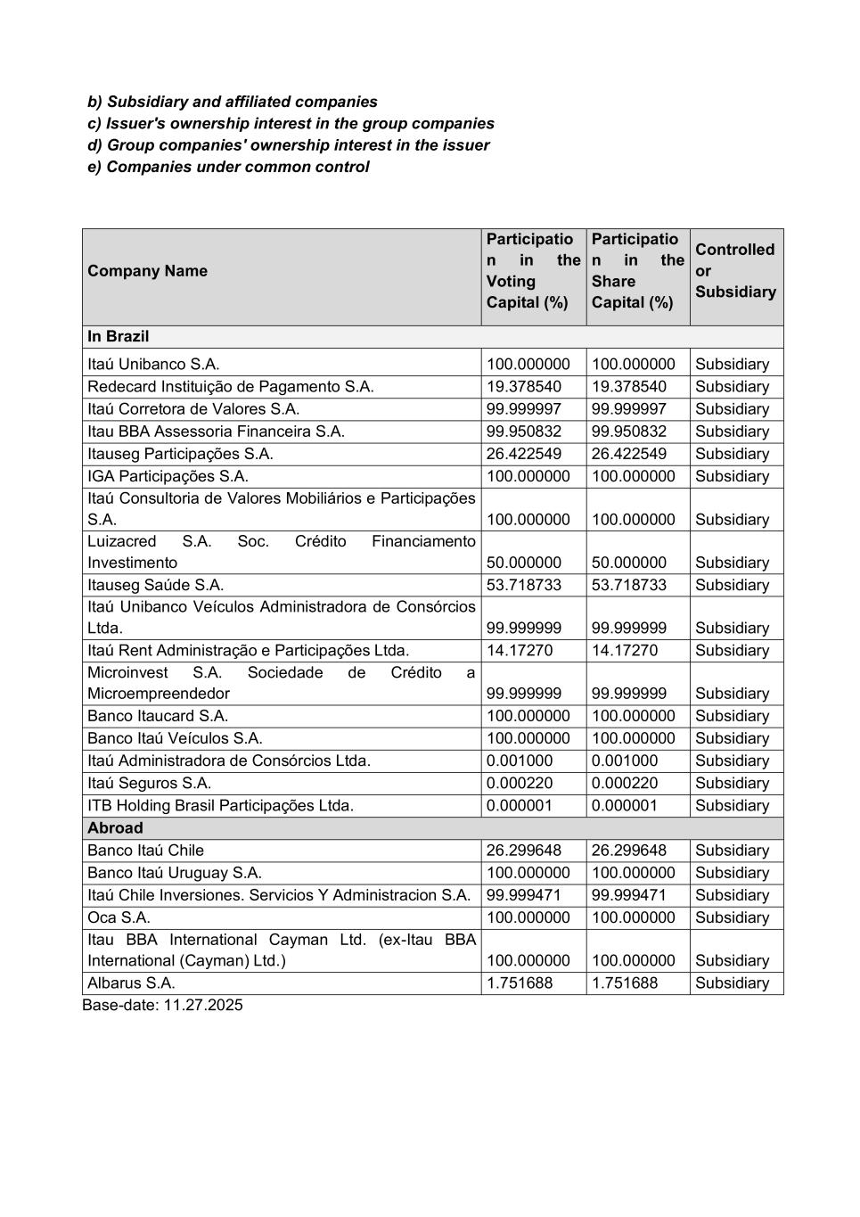 b) Subsidiary and affiliated companies c) Issuer's ownership interest in the group companies d) Group companies' ownership interest in the issuer e) Companies under common control Company Name Participatio n in the Voting Capital (%) Participatio n in the Share Capital (%) Controlled or Subsidiary In Brazil Itaú Unibanco S.A. 100.000000 100.000000 Subsidiary Redecard Instituição de Pagamento S.A. 19.378540 19.378540 Subsidiary Itaú Corretora de Valores S.A. 99.999997 99.999997 Subsidiary Itau BBA Assessoria Financeira S.A. 99.950832 99.950832 Subsidiary Itauseg Participações S.A. 26.422549 26.422549 Subsidiary IGA Participações S.A. 100.000000 100.000000 Subsidiary Itaú Consultoria de Valores Mobiliários e Participações S.A. 100.000000 100.000000 Subsidiary Luizacred S.A. Soc. Crédito Financiamento Investimento 50.000000 50.000000 Subsidiary Itauseg Saúde S.A. 53.718733 53.718733 Subsidiary Itaú Unibanco Veículos Administradora de Consórcios Ltda. 99.999999 99.999999 Subsidiary Itaú Rent Administração e Participações Ltda. 14.17270 14.17270 Subsidiary Microinvest S.A. Sociedade de Crédito a Microempreendedor 99.999999 99.999999 Subsidiary Banco Itaucard S.A. 100.000000 100.000000 Subsidiary Banco Itaú Veículos S.A. 100.000000 100.000000 Subsidiary Itaú Administradora de Consórcios Ltda. 0.001000 0.001000 Subsidiary Itaú Seguros S.A. 0.000220 0.000220 Subsidiary ITB Holding Brasil Participações Ltda. 0.000001 0.000001 Subsidiary Abroad Banco Itaú Chile 26.299648 26.299648 Subsidiary Banco Itaú Uruguay S.A. 100.000000 100.000000 Subsidiary Itaú Chile Inversiones. Servicios Y Administracion S.A. 99.999471 99.999471 Subsidiary Oca S.A. 100.000000 100.000000 Subsidiary Itau BBA International Cayman Ltd. (ex-Itau BBA International (Cayman) Ltd.) 100.000000 100.000000 Subsidiary Albarus S.A. 1.751688 1.751688 Subsidiary Base-date: 11.27.2025