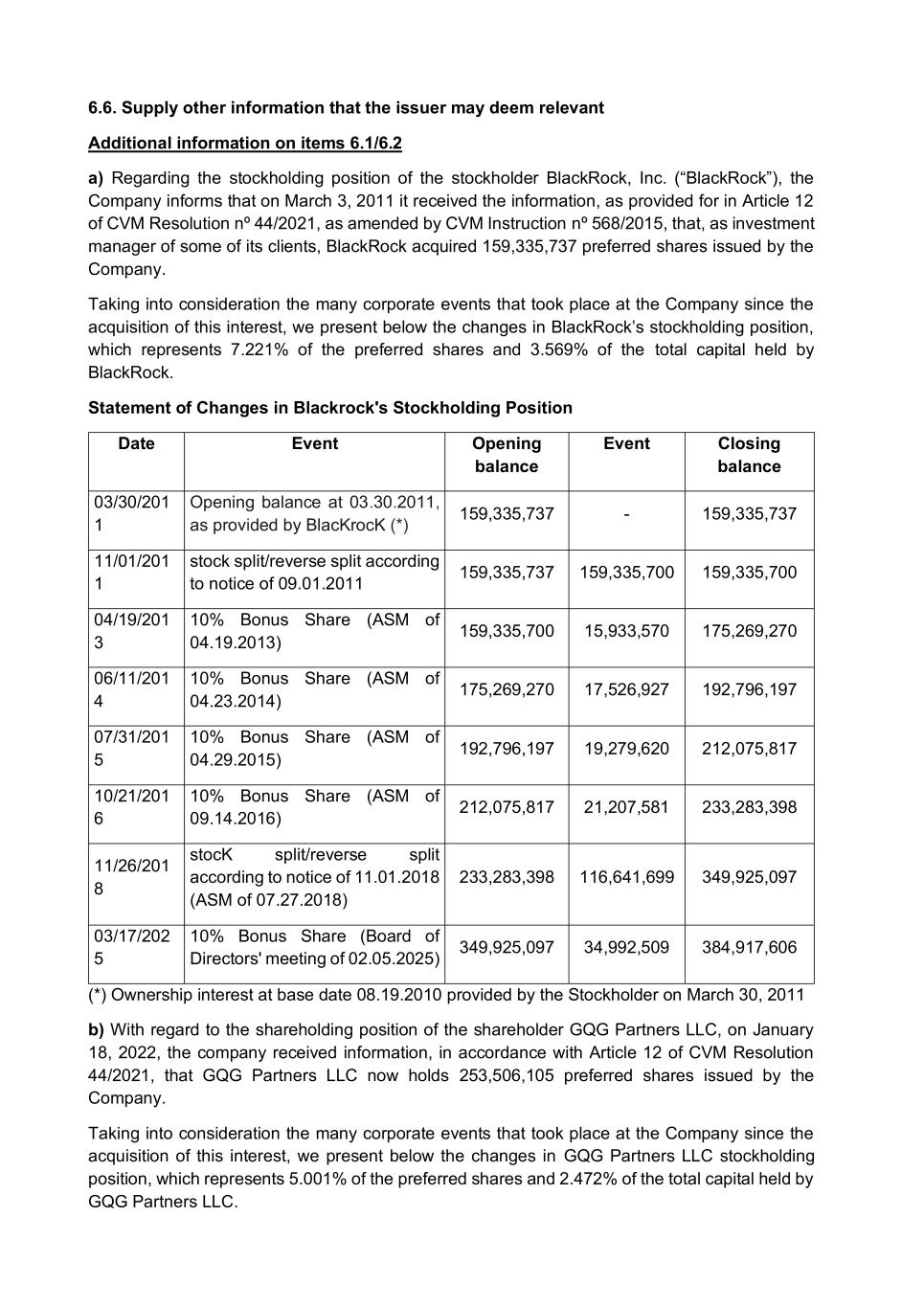 6.6. Supply other information that the issuer may deem relevant Additional information on items 6.1/6.2 a) Regarding the stockholding position of the stockholder BlackRock, Inc. (“BlackRock”), the Company informs that on March 3, 2011 it received the information, as provided for in Article 12 of CVM Resolution nº 44/2021, as amended by CVM Instruction nº 568/2015, that, as investment manager of some of its clients, BlackRock acquired 159,335,737 preferred shares issued by the Company. Taking into consideration the many corporate events that took place at the Company since the acquisition of this interest, we present below the changes in BlackRock’s stockholding position, which represents 7.221% of the preferred shares and 3.569% of the total capital held by BlackRock. Statement of Changes in Blackrock's Stockholding Position Date Event Opening balance Event Closing balance 03/30/201 1 Opening balance at 03.30.2011, as provided by BlacKrocK (*) 159,335,737 - 159,335,737 11/01/201 1 stock split/reverse split according to notice of 09.01.2011 159,335,737 159,335,700 159,335,700 04/19/201 3 10% Bonus Share (ASM of 04.19.2013) 159,335,700 15,933,570 175,269,270 06/11/201 4 10% Bonus Share (ASM of 04.23.2014) 175,269,270 17,526,927 192,796,197 07/31/201 5 10% Bonus Share (ASM of 04.29.2015) 192,796,197 19,279,620 212,075,817 10/21/201 6 10% Bonus Share (ASM of 09.14.2016) 212,075,817 21,207,581 233,283,398 11/26/201 8 stocK split/reverse split according to notice of 11.01.2018 (ASM of 07.27.2018) 233,283,398 116,641,699 349,925,097 03/17/202 5 10% Bonus Share (Board of Directors' meeting of 02.05.2025) 349,925,097 34,992,509 384,917,606 (*) Ownership interest at base date 08.19.2010 provided by the Stockholder on March 30, 2011 b) With regard to the shareholding position of the shareholder GQG Partners LLC, on January 18, 2022, the company received information, in accordance with Article 12 of CVM Resolution 44/2021, that GQG Partners LLC now holds 253,506,105 preferred shares issued by the Company. Taking into consideration the many corporate events that took place at the Company since the acquisition of this interest, we present below the changes in GQG Partners LLC stockholding position, which represents 5.001% of the preferred shares and 2.472% of the total capital held by GQG Partners LLC.