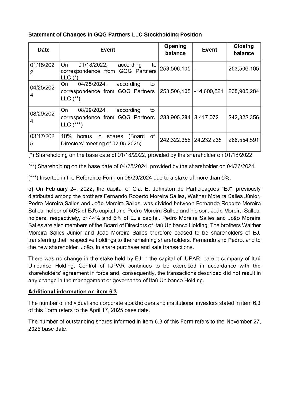 Statement of Changes in GQG Partners LLC Stockholding Position Date Event Opening balance Event Closing balance 01/18/202 2 On 01/18/2022, according to correspondence from GQG Partners LLC (*) 253,506,105 - 253,506,105 04/25/202 4 On 04/25/2024, according to correspondence from GQG Partners LLC (**) 253,506,105 -14,600,821 238,905,284 08/29/202 4 On 08/29/2024, according to correspondence from GQG Partners LLC (***) 238,905,284 3,417,072 242,322,356 03/17/202 5 10% bonus in shares (Board of Directors' meeting of 02.05.2025) 242,322,356 24,232,235 266,554,591 (*) Shareholding on the base date of 01/18/2022, provided by the shareholder on 01/18/2022. (**) Shareholding on the base date of 04/25/2024, provided by the shareholder on 04/26/2024. (***) Inserted in the Reference Form on 08/29/2024 due to a stake of more than 5%. c) On February 24, 2022, the capital of Cia. E. Johnston de Participações "EJ", previously distributed among the brothers Fernando Roberto Moreira Salles, Walther Moreira Salles Júnior, Pedro Moreira Salles and João Moreira Salles, was divided between Fernando Roberto Moreira Salles, holder of 50% of EJ's capital and Pedro Moreira Salles and his son, João Moreira Salles, holders, respectively, of 44% and 6% of EJ's capital. Pedro Moreira Salles and João Moreira Salles are also members of the Board of Directors of Itaú Unibanco Holding. The brothers Walther Moreira Salles Júnior and João Moreira Salles therefore ceased to be shareholders of EJ, transferring their respective holdings to the remaining shareholders, Fernando and Pedro, and to the new shareholder, João, in share purchase and sale transactions. There was no change in the stake held by EJ in the capital of IUPAR, parent company of Itaú Unibanco Holding. Control of IUPAR continues to be exercised in accordance with the shareholders' agreement in force and, consequently, the transactions described did not result in any change in the management or governance of Itaú Unibanco Holding. Additional information on item 6.3 The number of individual and corporate stockholders and institutional investors stated in item 6.3 of this Form refers to the April 17, 2025 base date. The number of outstanding shares informed in item 6.3 of this Form refers to the November 27, 2025 base date.
