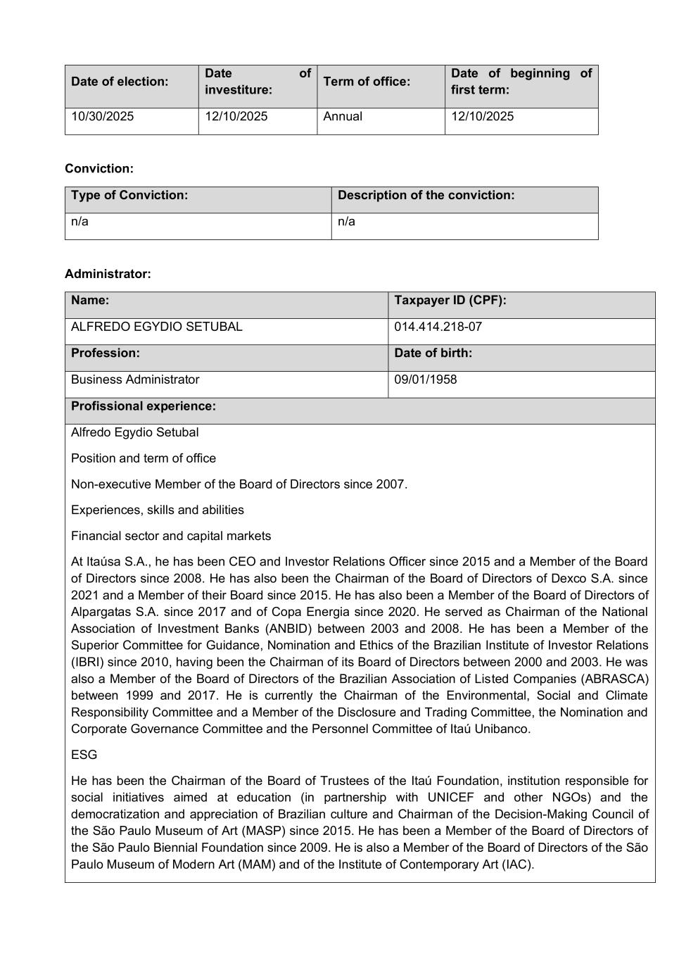 Date of election: Date of investiture: Term of office: Date of beginning of first term: 10/30/2025 12/10/2025 Annual 12/10/2025 Conviction: Type of Conviction: Description of the conviction: n/a n/a Administrator: Name: Taxpayer ID (CPF): ALFREDO EGYDIO SETUBAL 014.414.218-07 Profession: Date of birth: Business Administrator 09/01/1958 Profissional experience: Alfredo Egydio Setubal Position and term of office Non-executive Member of the Board of Directors since 2007. Experiences, skills and abilities Financial sector and capital markets At Itaúsa S.A., he has been CEO and Investor Relations Officer since 2015 and a Member of the Board of Directors since 2008. He has also been the Chairman of the Board of Directors of Dexco S.A. since 2021 and a Member of their Board since 2015. He has also been a Member of the Board of Directors of Alpargatas S.A. since 2017 and of Copa Energia since 2020. He served as Chairman of the National Association of Investment Banks (ANBID) between 2003 and 2008. He has been a Member of the Superior Committee for Guidance, Nomination and Ethics of the Brazilian Institute of Investor Relations (IBRI) since 2010, having been the Chairman of its Board of Directors between 2000 and 2003. He was also a Member of the Board of Directors of the Brazilian Association of Listed Companies (ABRASCA) between 1999 and 2017. He is currently the Chairman of the Environmental, Social and Climate Responsibility Committee and a Member of the Disclosure and Trading Committee, the Nomination and Corporate Governance Committee and the Personnel Committee of Itaú Unibanco. ESG He has been the Chairman of the Board of Trustees of the Itaú Foundation, institution responsible for social initiatives aimed at education (in partnership with UNICEF and other NGOs) and the democratization and appreciation of Brazilian culture and Chairman of the Decision-Making Council of the São Paulo Museum of Art (MASP) since 2015. He has been a Member of the Board of Directors of the São Paulo Biennial Foundation since 2009. He is also a Member of the Board of Directors of the São Paulo Museum of Modern Art (MAM) and of the Institute of Contemporary Art (IAC).