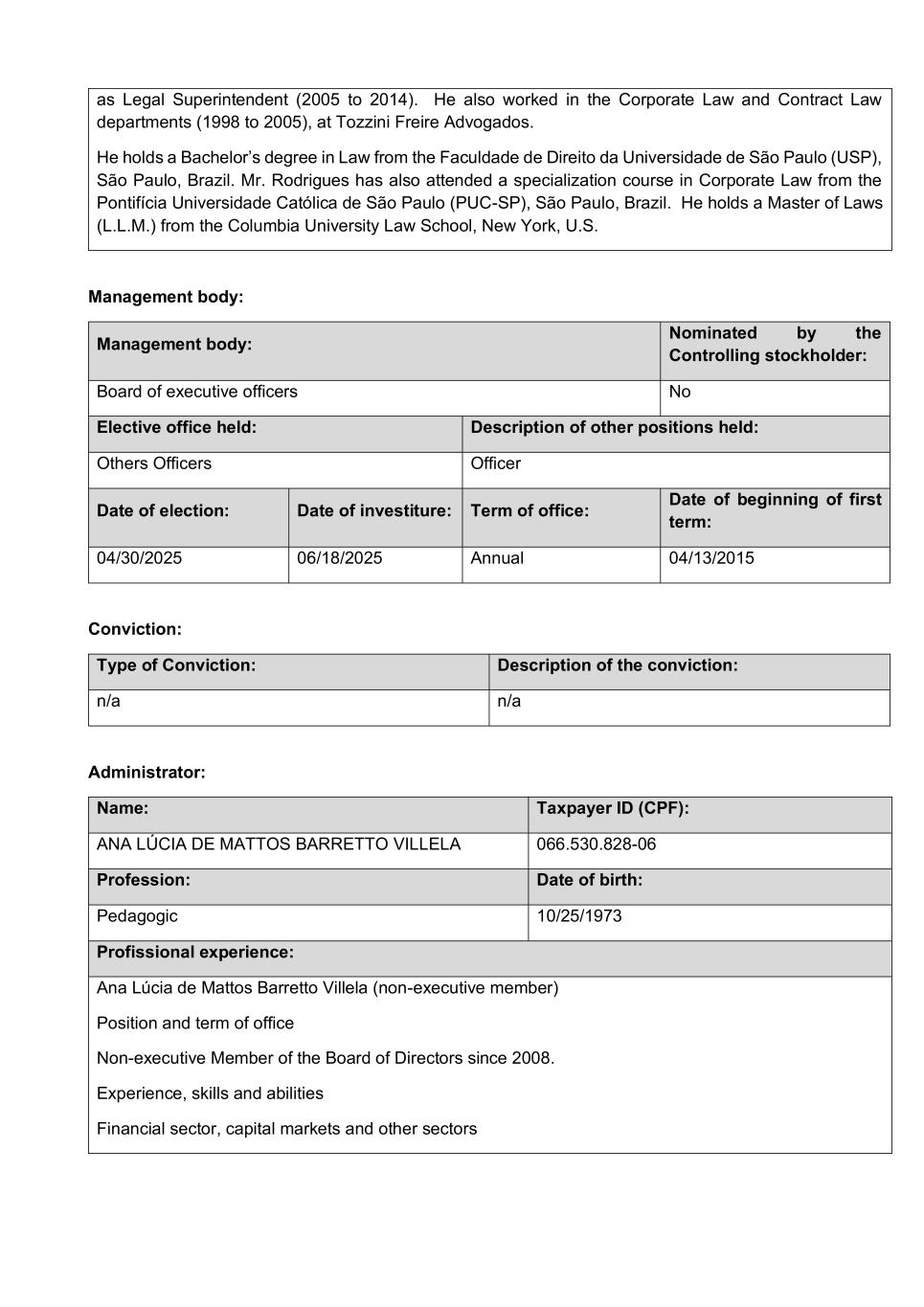 as Legal Superintendent (2005 to 2014). He also worked in the Corporate Law and Contract Law departments (1998 to 2005), at Tozzini Freire Advogados. He holds a Bachelor’s degree in Law from the Faculdade de Direito da Universidade de São Paulo (USP), São Paulo, Brazil. Mr. Rodrigues has also attended a specialization course in Corporate Law from the Pontifícia Universidade Católica de São Paulo (PUC-SP), São Paulo, Brazil. He holds a Master of Laws (L.L.M.) from the Columbia University Law School, New York, U.S. Management body: Management body: Nominated by the Controlling stockholder: Board of executive officers No Elective office held: Description of other positions held: Others Officers Officer Date of election: Date of investiture: Term of office: Date of beginning of first term: 04/30/2025 06/18/2025 Annual 04/13/2015 Conviction: Type of Conviction: Description of the conviction: n/a n/a Administrator: Name: Taxpayer ID (CPF): ANA LÚCIA DE MATTOS BARRETTO VILLELA 066.530.828-06 Profession: Date of birth: Pedagogic 10/25/1973 Profissional experience: Ana Lúcia de Mattos Barretto Villela (non-executive member) Position and term of office Non-executive Member of the Board of Directors since 2008. Experience, skills and abilities Financial sector, capital markets and other sectors