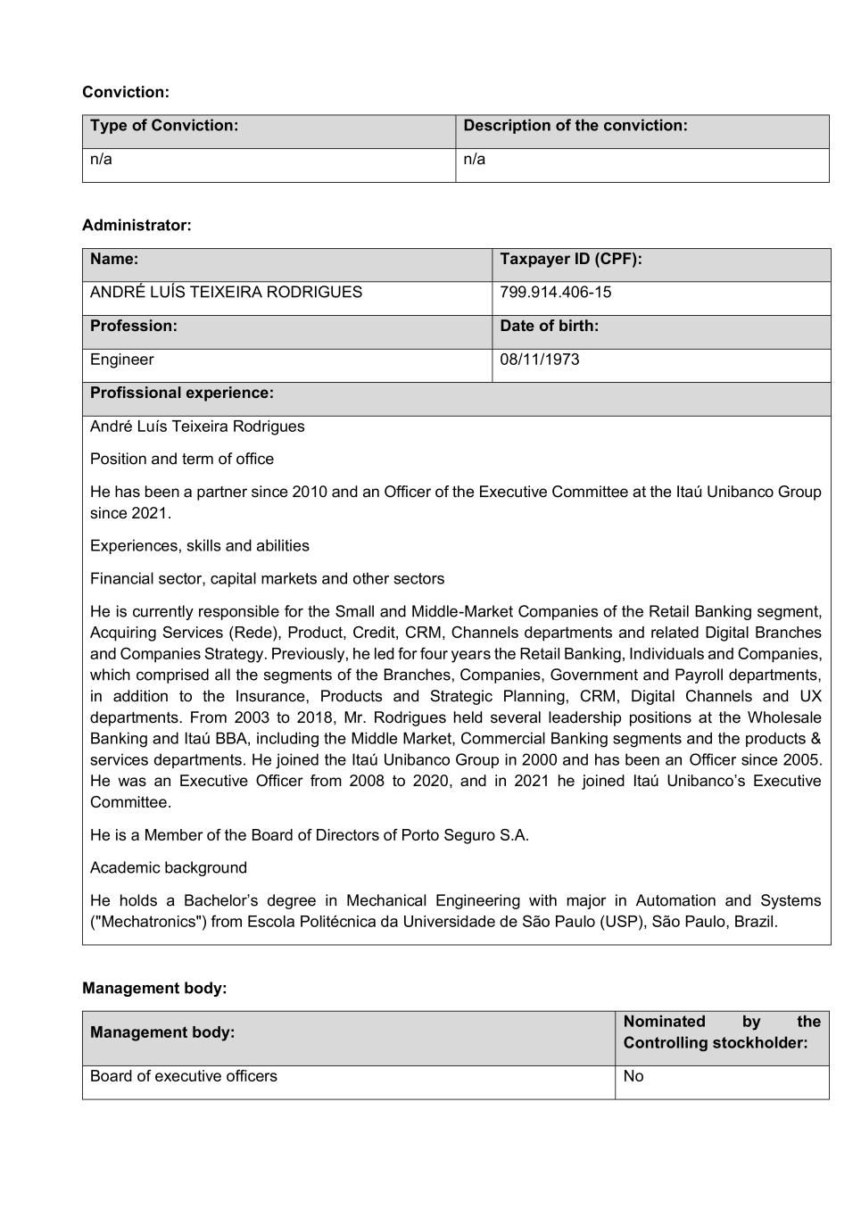 Conviction: Type of Conviction: Description of the conviction: n/a n/a Administrator: Name: Taxpayer ID (CPF): ANDRÉ LUÍS TEIXEIRA RODRIGUES 799.914.406-15 Profession: Date of birth: Engineer 08/11/1973 Profissional experience: André Luís Teixeira Rodrigues Position and term of office He has been a partner since 2010 and an Officer of the Executive Committee at the Itaú Unibanco Group since 2021. Experiences, skills and abilities Financial sector, capital markets and other sectors He is currently responsible for the Small and Middle-Market Companies of the Retail Banking segment, Acquiring Services (Rede), Product, Credit, CRM, Channels departments and related Digital Branches and Companies Strategy. Previously, he led for four years the Retail Banking, Individuals and Companies, which comprised all the segments of the Branches, Companies, Government and Payroll departments, in addition to the Insurance, Products and Strategic Planning, CRM, Digital Channels and UX departments. From 2003 to 2018, Mr. Rodrigues held several leadership positions at the Wholesale Banking and Itaú BBA, including the Middle Market, Commercial Banking segments and the products & services departments. He joined the Itaú Unibanco Group in 2000 and has been an Officer since 2005. He was an Executive Officer from 2008 to 2020, and in 2021 he joined Itaú Unibanco’s Executive Committee. He is a Member of the Board of Directors of Porto Seguro S.A. Academic background He holds a Bachelor’s degree in Mechanical Engineering with major in Automation and Systems ("Mechatronics") from Escola Politécnica da Universidade de São Paulo (USP), São Paulo, Brazil. Management body: Management body: Nominated by the Controlling stockholder: Board of executive officers No