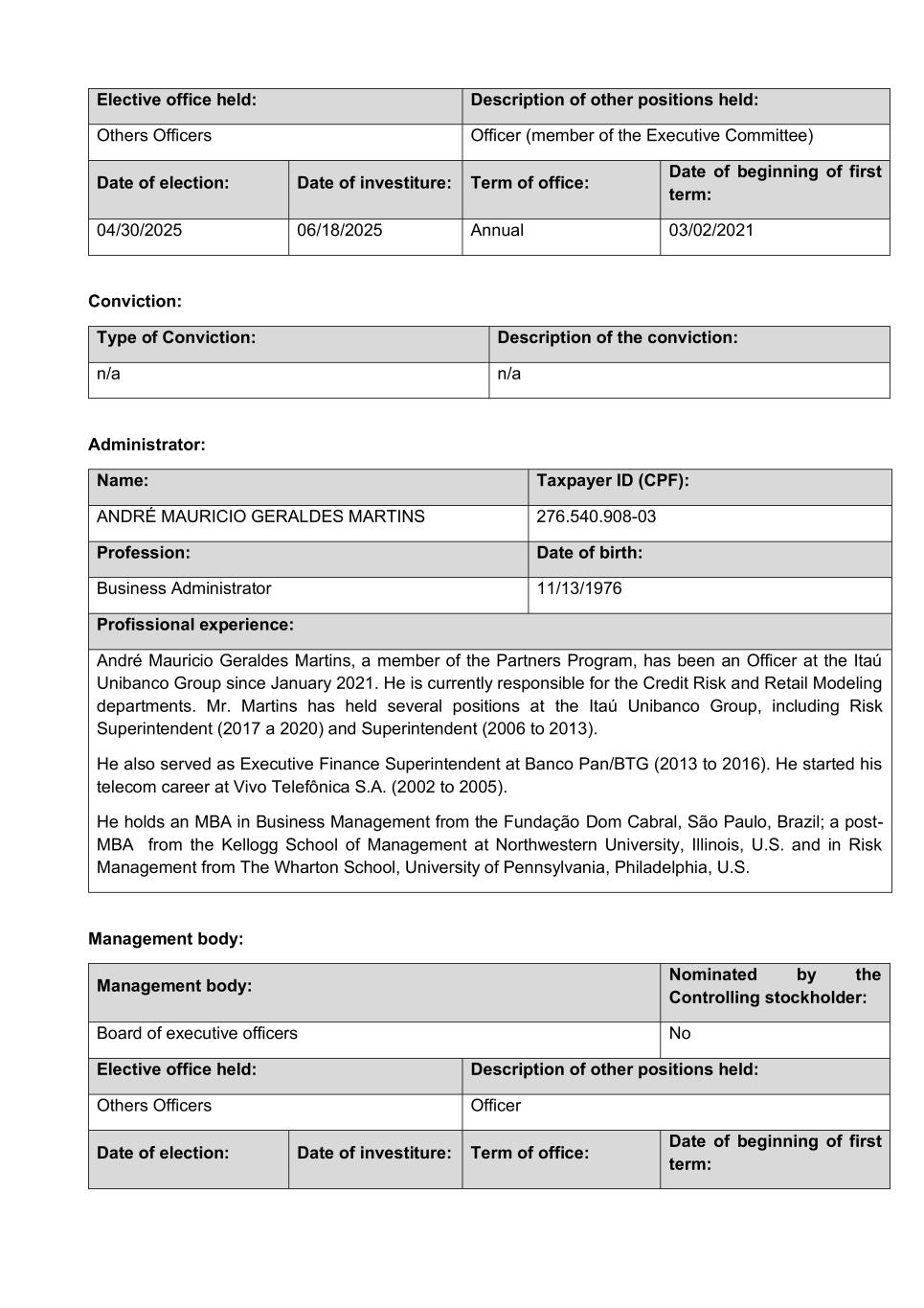 Elective office held: Description of other positions held: Others Officers Officer (member of the Executive Committee) Date of election: Date of investiture: Term of office: Date of beginning of first term: 04/30/2025 06/18/2025 Annual 03/02/2021 Conviction: Type of Conviction: Description of the conviction: n/a n/a Administrator: Name: Taxpayer ID (CPF): ANDRÉ MAURICIO GERALDES MARTINS 276.540.908-03 Profession: Date of birth: Business Administrator 11/13/1976 Profissional experience: André Mauricio Geraldes Martins, a member of the Partners Program, has been an Officer at the Itaú Unibanco Group since January 2021. He is currently responsible for the Credit Risk and Retail Modeling departments. Mr. Martins has held several positions at the Itaú Unibanco Group, including Risk Superintendent (2017 a 2020) and Superintendent (2006 to 2013). He also served as Executive Finance Superintendent at Banco Pan/BTG (2013 to 2016). He started his telecom career at Vivo Telefônica S.A. (2002 to 2005). He holds an MBA in Business Management from the Fundação Dom Cabral, São Paulo, Brazil; a post- MBA from the Kellogg School of Management at Northwestern University, Illinois, U.S. and in Risk Management from The Wharton School, University of Pennsylvania, Philadelphia, U.S. Management body: Management body: Nominated by the Controlling stockholder: Board of executive officers No Elective office held: Description of other positions held: Others Officers Officer Date of election: Date of investiture: Term of office: Date of beginning of first term:
