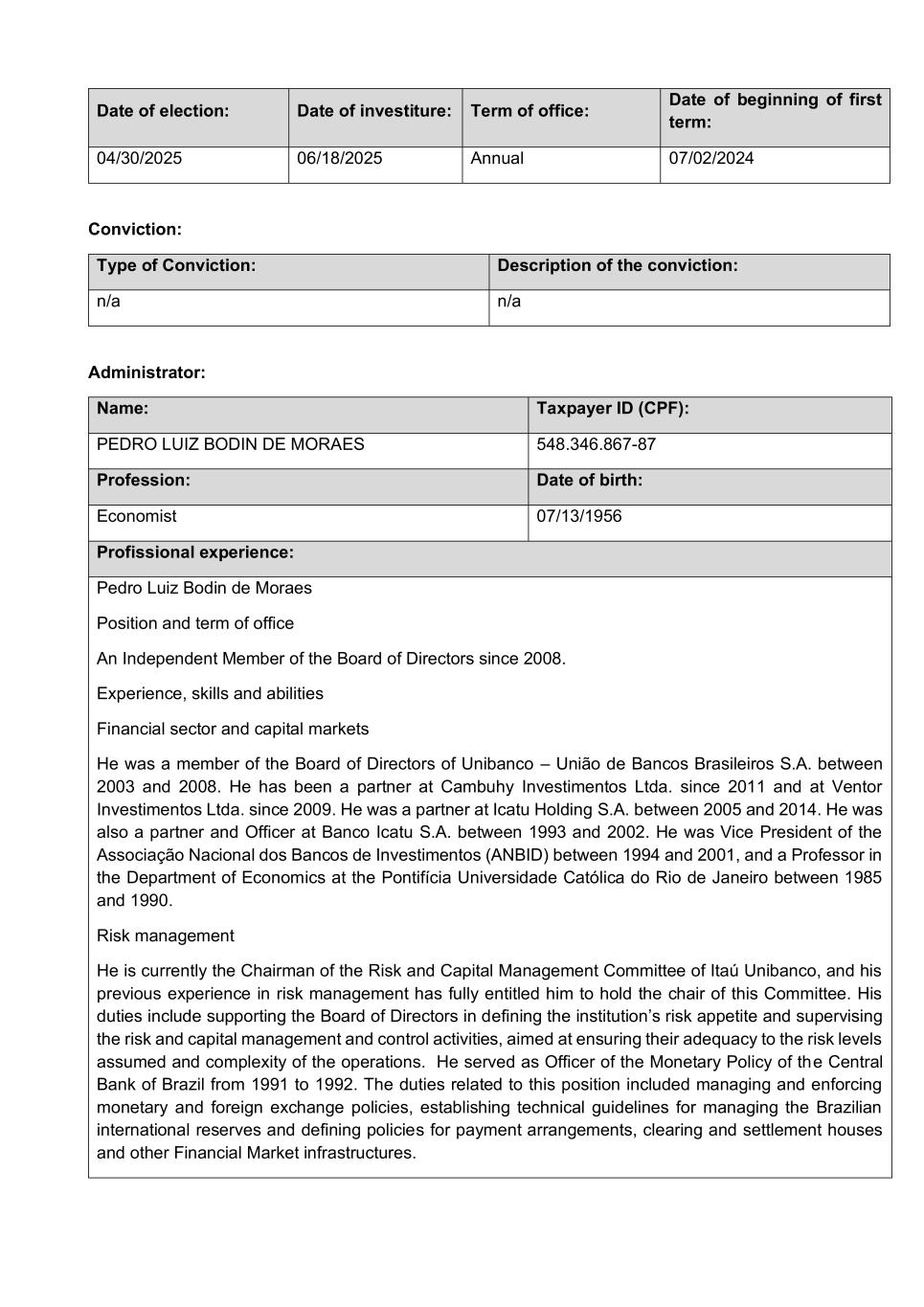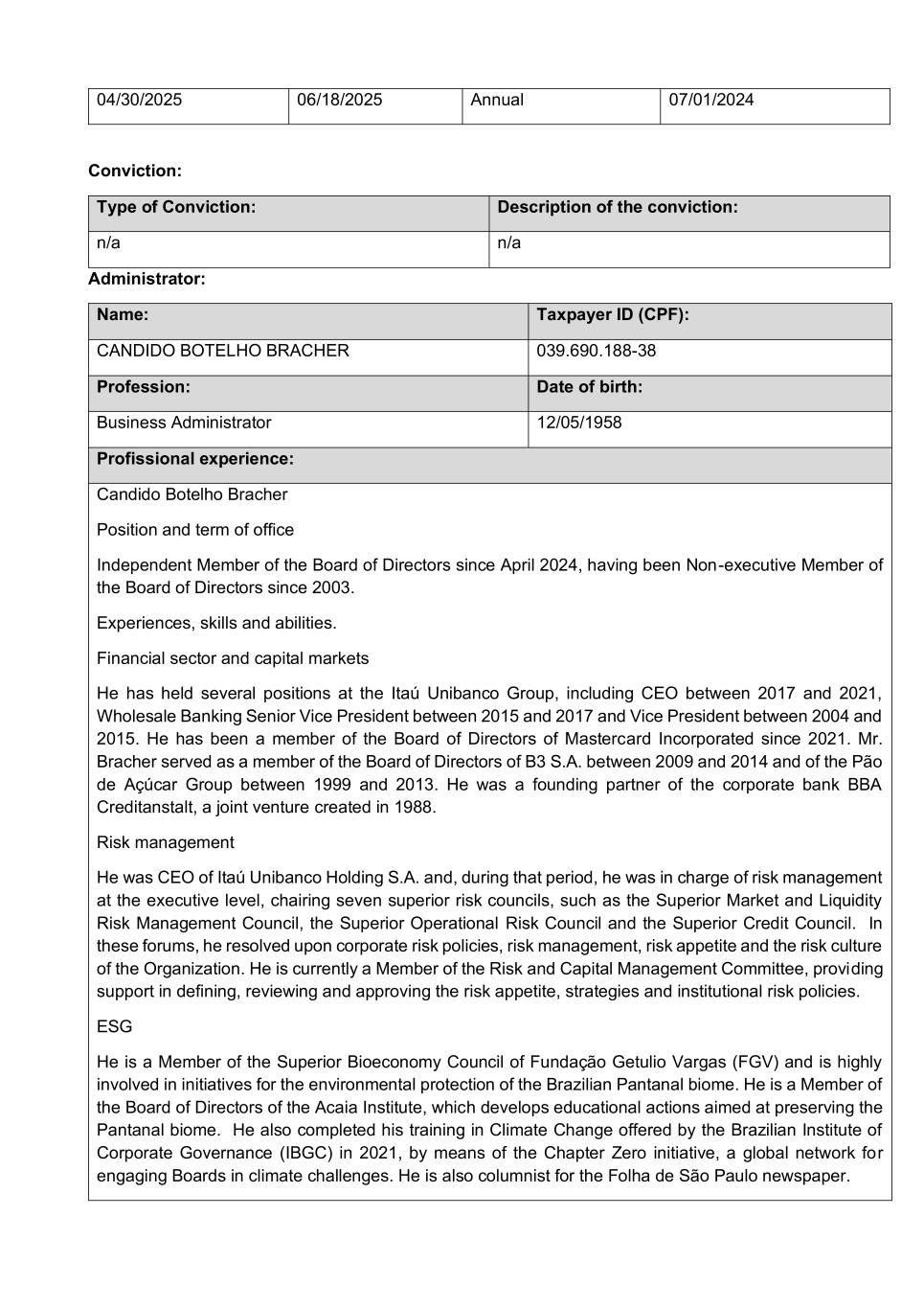04/30/2025 06/18/2025 Annual 07/01/2024 Conviction: Type of Conviction: Description of the conviction: n/a n/a Administrator: Name: Taxpayer ID (CPF): CANDIDO BOTELHO BRACHER 039.690.188-38 Profession: Date of birth: Business Administrator 12/05/1958 Profissional experience: Candido Botelho Bracher Position and term of office Independent Member of the Board of Directors since April 2024, having been Non-executive Member of the Board of Directors since 2003. Experiences, skills and abilities. Financial sector and capital markets He has held several positions at the Itaú Unibanco Group, including CEO between 2017 and 2021, Wholesale Banking Senior Vice President between 2015 and 2017 and Vice President between 2004 and 2015. He has been a member of the Board of Directors of Mastercard Incorporated since 2021. Mr. Bracher served as a member of the Board of Directors of B3 S.A. between 2009 and 2014 and of the Pão de Açúcar Group between 1999 and 2013. He was a founding partner of the corporate bank BBA Creditanstalt, a joint venture created in 1988. Risk management He was CEO of Itaú Unibanco Holding S.A. and, during that period, he was in charge of risk management at the executive level, chairing seven superior risk councils, such as the Superior Market and Liquidity Risk Management Council, the Superior Operational Risk Council and the Superior Credit Council. In these forums, he resolved upon corporate risk policies, risk management, risk appetite and the risk culture of the Organization. He is currently a Member of the Risk and Capital Management Committee, providing support in defining, reviewing and approving the risk appetite, strategies and institutional risk policies. ESG He is a Member of the Superior Bioeconomy Council of Fundação Getulio Vargas (FGV) and is highly involved in initiatives for the environmental protection of the Brazilian Pantanal biome. He is a Member of the Board of Directors of the Acaia Institute, which develops educational actions aimed at preserving the Pantanal biome. He also completed his training in Climate Change offered by the Brazilian Institute of Corporate Governance (IBGC) in 2021, by means of the Chapter Zero initiative, a global network for engaging Boards in climate challenges. He is also columnist for the Folha de São Paulo newspaper.