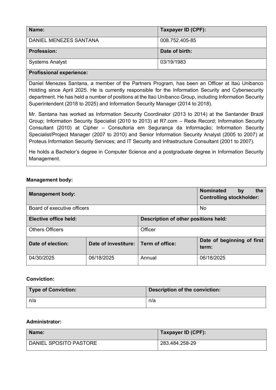 Name: Taxpayer ID (CPF): DANIEL MENEZES SANTANA 008.752.405-85 Profession: Date of birth: Systems Analyst 03/19/1983 Profissional experience: Daniel Menezes Santana, a member of the Partners Program, has been an Officer at Itaú Unibanco Holding since April 2025. He is currently responsible for the Information Security and Cybersecurity department. He has held a number of positions at the Itaú Unibanco Group, including Information Security Superintendent (2018 to 2025) and Information Security Manager (2014 to 2018). Mr. Santana has worked as Information Security Coordinator (2013 to 2014) at the Santander Brazil Group; Information Security Specialist (2010 to 2013) at R7.com – Rede Record; Information Security Consultant (2010) at Cipher – Consultoria em Segurança da Informação; Information Security Specialist/Project Manager (2007 to 2010) and Senior Information Security Analyst (2005 to 2007) at Proteus Information Security Services; and IT Security and Infrastructure Consultant (2001 to 2007). He holds a Bachelor’s degree in Computer Science and a postgraduate degree in Information Security Management. Management body: Management body: Nominated by the Controlling stockholder: Board of executive officers No Elective office held: Description of other positions held: Others Officers Officer Date of election: Date of investiture: Term of office: Date of beginning of first term: 04/30/2025 06/18/2025 Annual 06/18/2025 Conviction: Type of Conviction: Description of the conviction: n/a n/a Administrator: Name: Taxpayer ID (CPF): DANIEL SPOSITO PASTORE 283.484.258-29